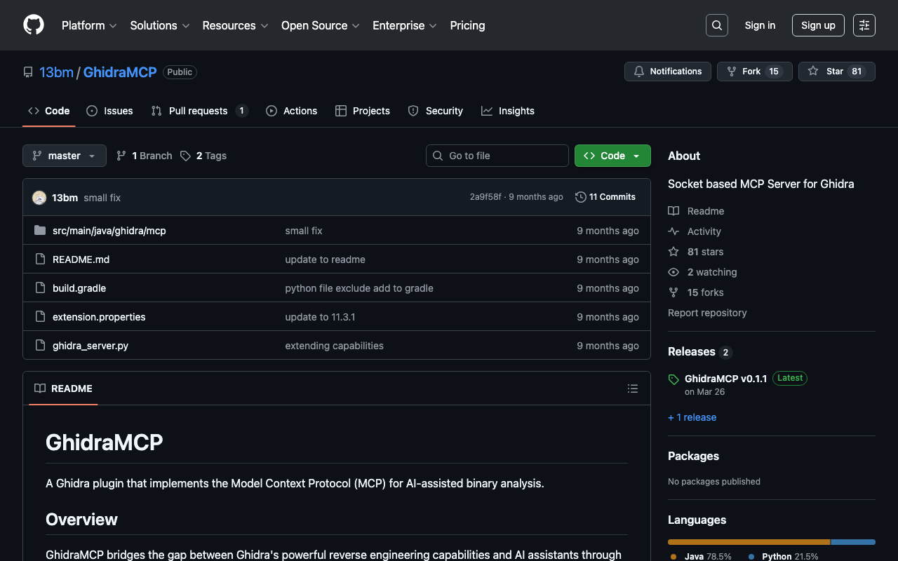 Extend Claude with 13bm GhidraMCP capabilitiesIntegrate external data into AI conversationsAutomate workflows combining Claude with specialized servicesBuild custom AI-powered development tools
