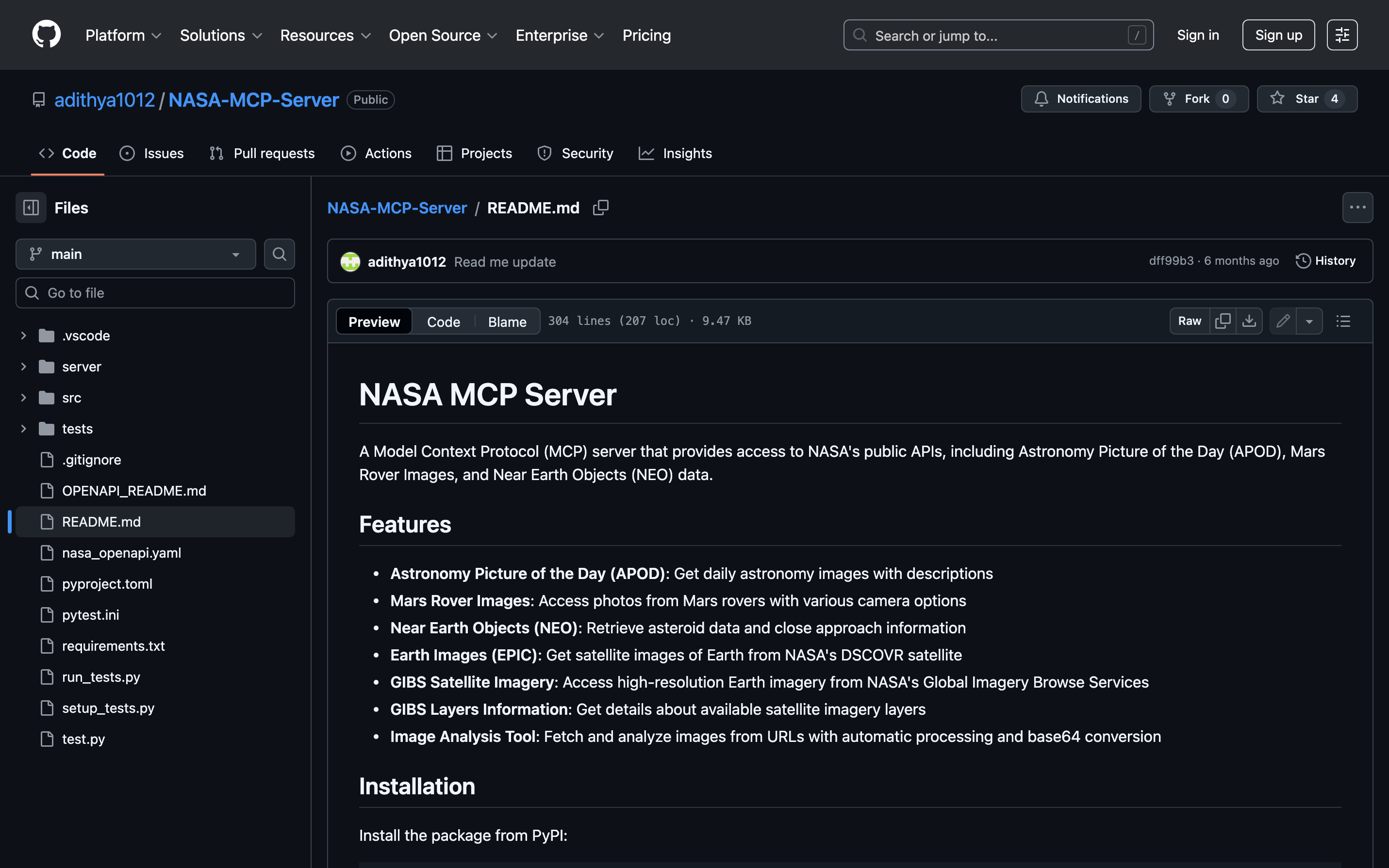MCP server providing access to NASA's visual data APIs including Mars Rover photos, Earth satellite imagery (EPIC/GIBS), and Astronomy picture of the day. Features built-in image analysis tools with automatic format detection, compression, and base64 conversion for LLM integration.