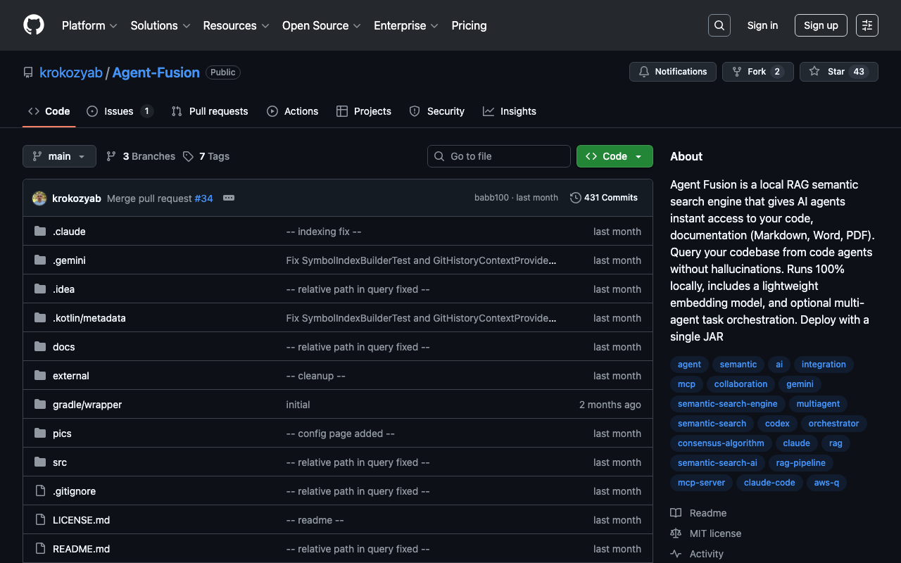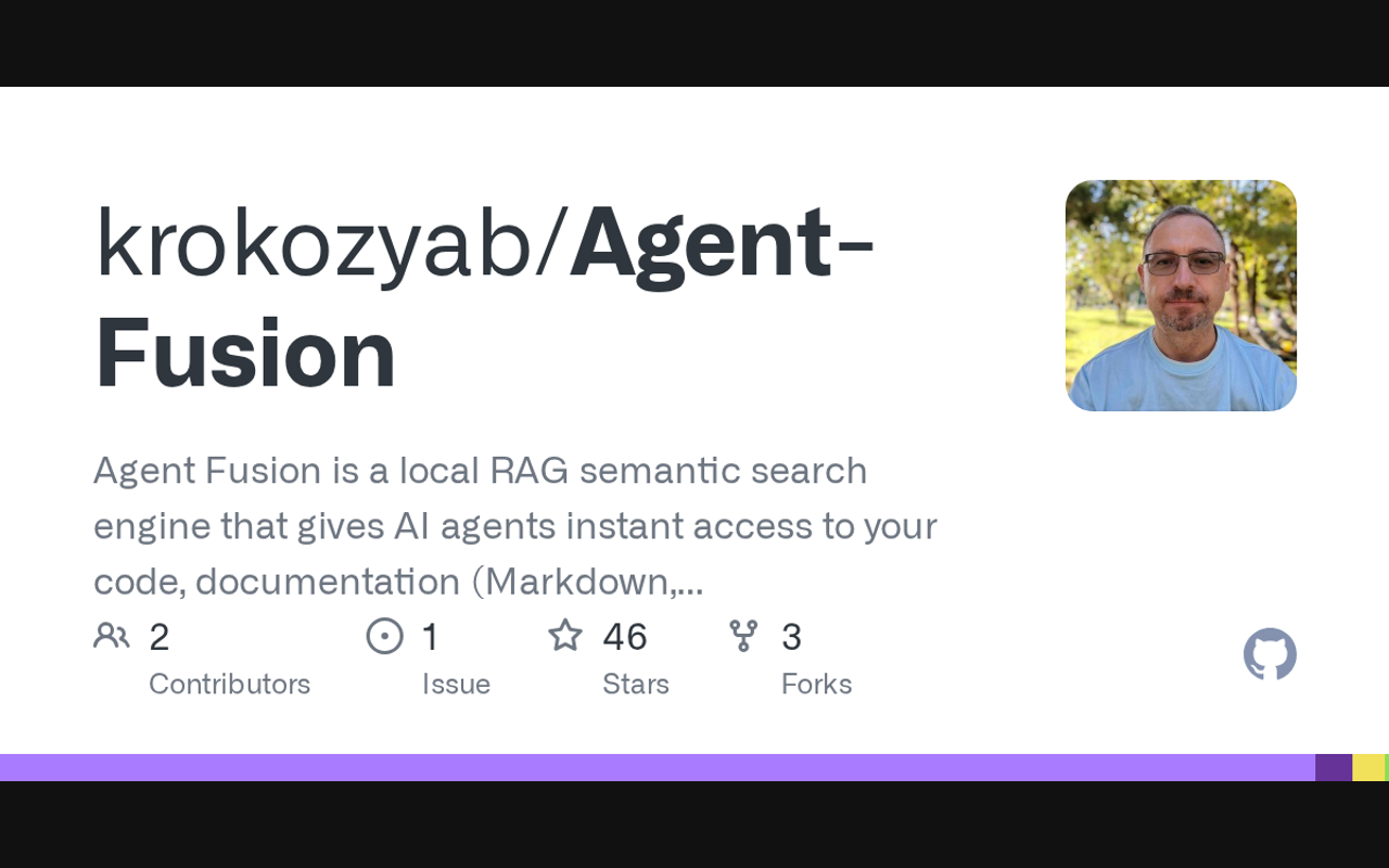 Agent Fusion is a local RAG semantic search engine that gives AI agents instant access to your code, documentation (Markdown, Word, PDF). Query your codebase from code agents without hallucinations. Runs 100% locally, includes a lightweight embedding model, and optional multi-agent task orchestration. Deploy with a single JAR