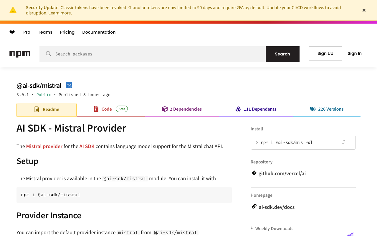 The **[Mistral provider](https://ai-sdk.dev/providers/ai-sdk-providers/mistral)** for the [AI SDK](https://ai-sdk.dev/docs) contains language model support for the Mistral chat API.