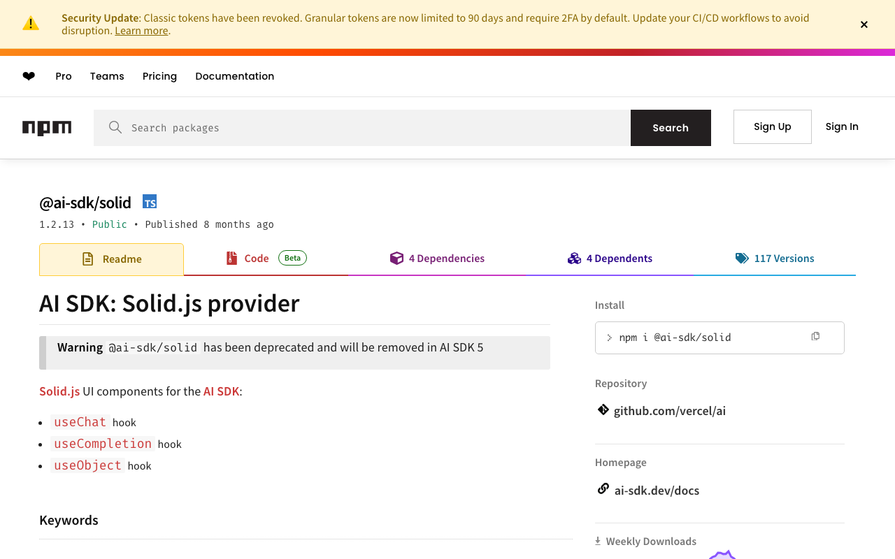> **Warning** `@ai-sdk/solid` has been deprecated and will be removed in AI SDK 5
