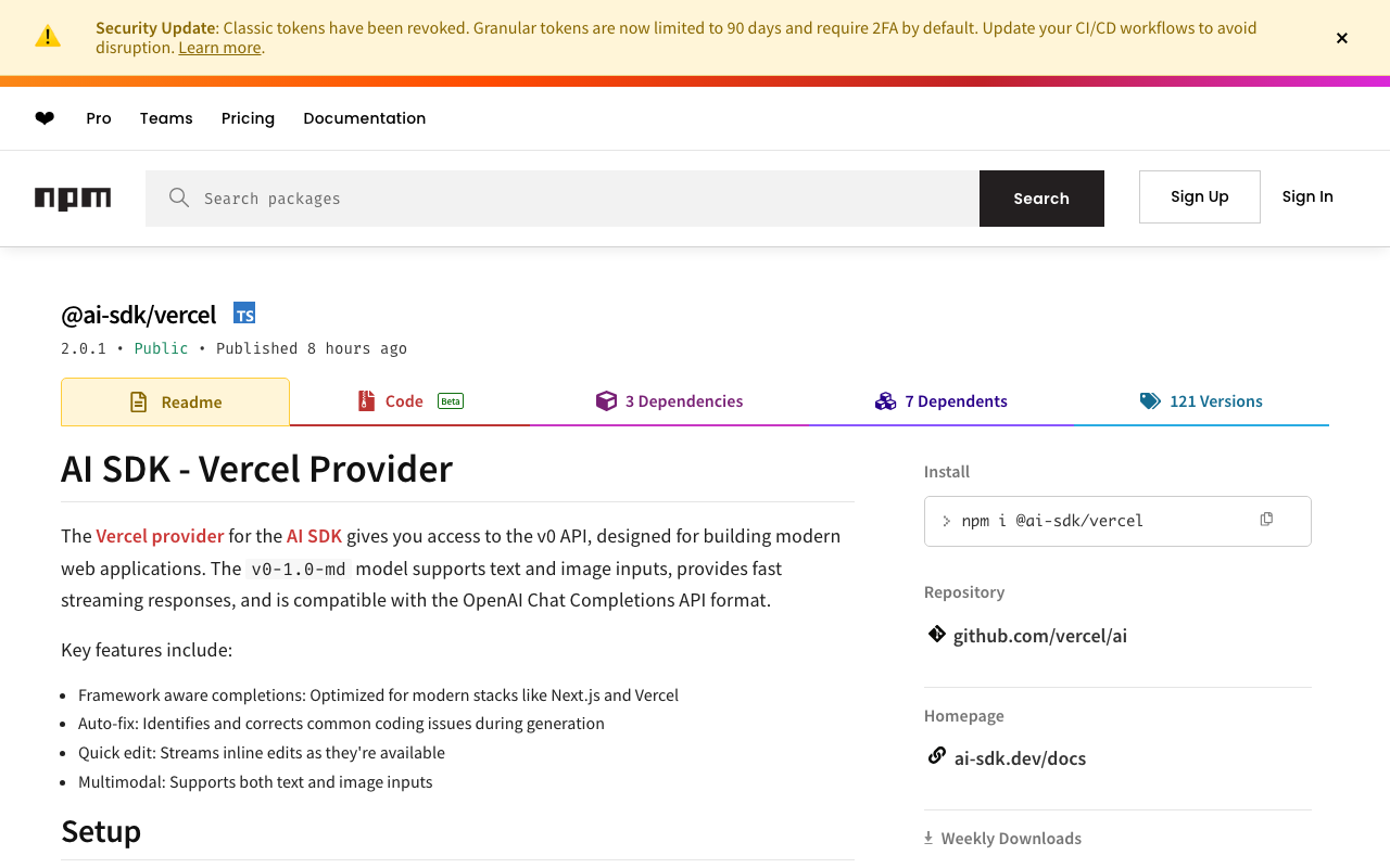 The **[Vercel provider](https://ai-sdk.dev/providers/ai-sdk-providers/vercel)** for the [AI SDK](https://ai-sdk.dev/docs) gives you access to the v0 API, designed for building modern web applications. The `v0-1.0-md` model supports text and image inputs,