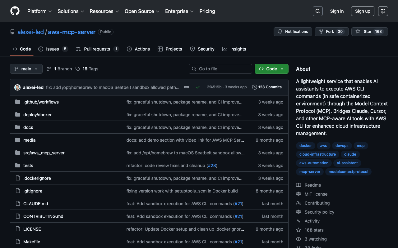 A lightweight service that enables AI assistants to execute AWS CLI commands (in safe containerized environment) through the Model Context Protocol (MCP). Bridges Claude, Cursor, and other MCP-aware AI tools with AWS CLI for enhanced cloud infrastructure management.
