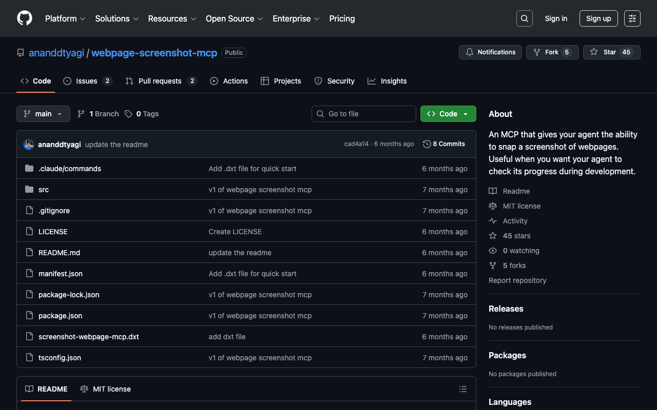 Extend Claude with ananddtyagi webpage screenshot mcp capabilitiesIntegrate external data into AI conversationsAutomate workflows combining Claude with specialized servicesBuild custom AI-powered development tools