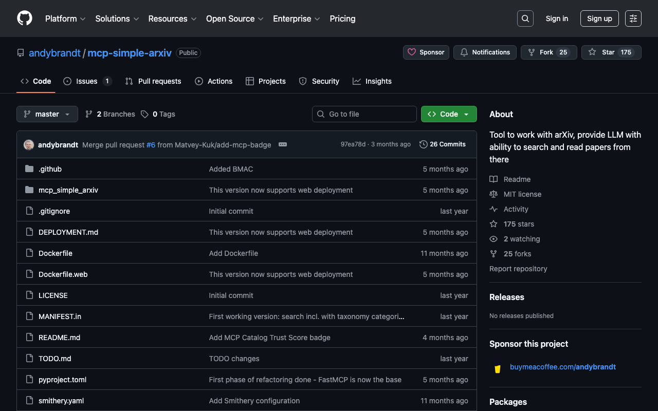 Extend Claude with andybrandt mcp simple arxiv capabilitiesIntegrate external data into AI conversationsAutomate workflows combining Claude with specialized servicesBuild custom AI-powered development tools
