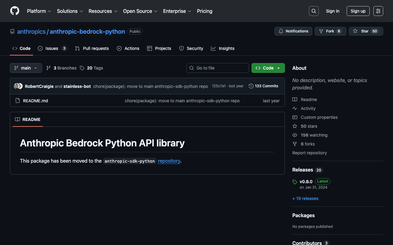 Official Anthropic resource for anthropic bedrock python. Part of the Claude ecosystem maintained by Anthropic.