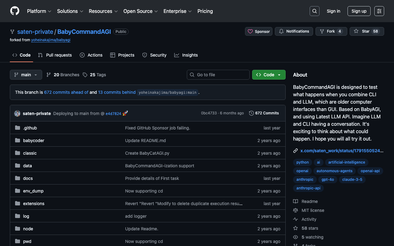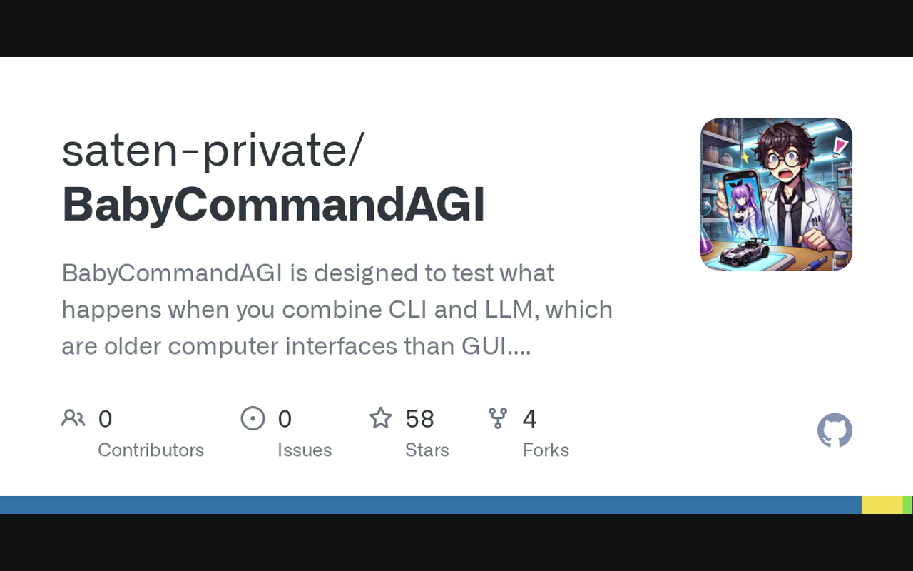 BabyCommandAGI is designed to test what happens when you combine CLI and LLM, which are older computer interfaces than GUI. Based on BabyAGI, and using Latest LLM API. Imagine LLM and CLI having a conversation. It's exciting to think about what could happen. I hope you will all try it out.