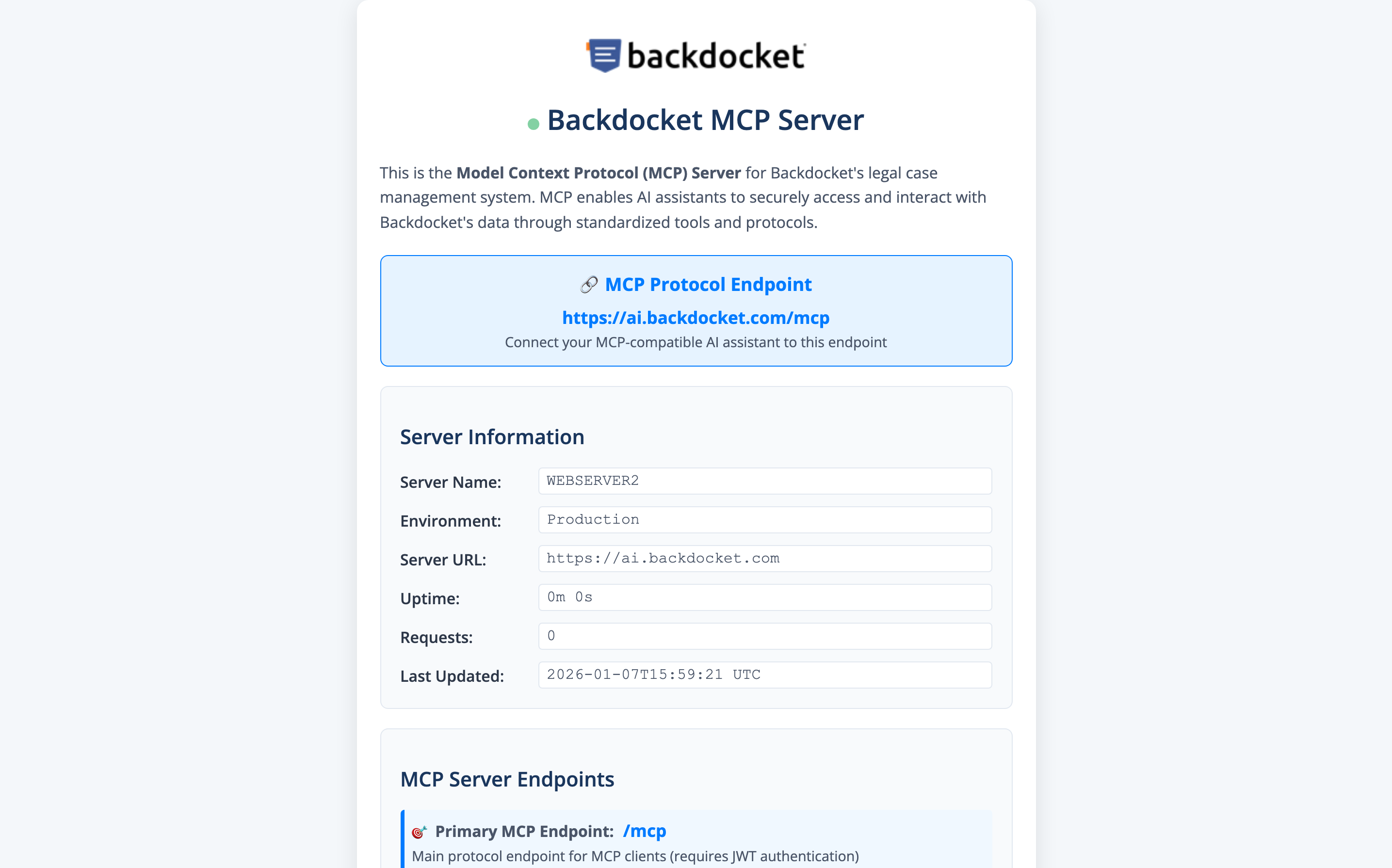 Search, Retrieve, and Update your **[Backdocket](https://backdocket.com)** data. This currently includes Claims, Matters, Contacts, Tasks and Advanced Searches. To easily use the Remote Mcp Server utilize the following url: **[https://ai.backdocket.com/mcp]([https://backdocket.com](https://ai.backdocket.com/mcp))**