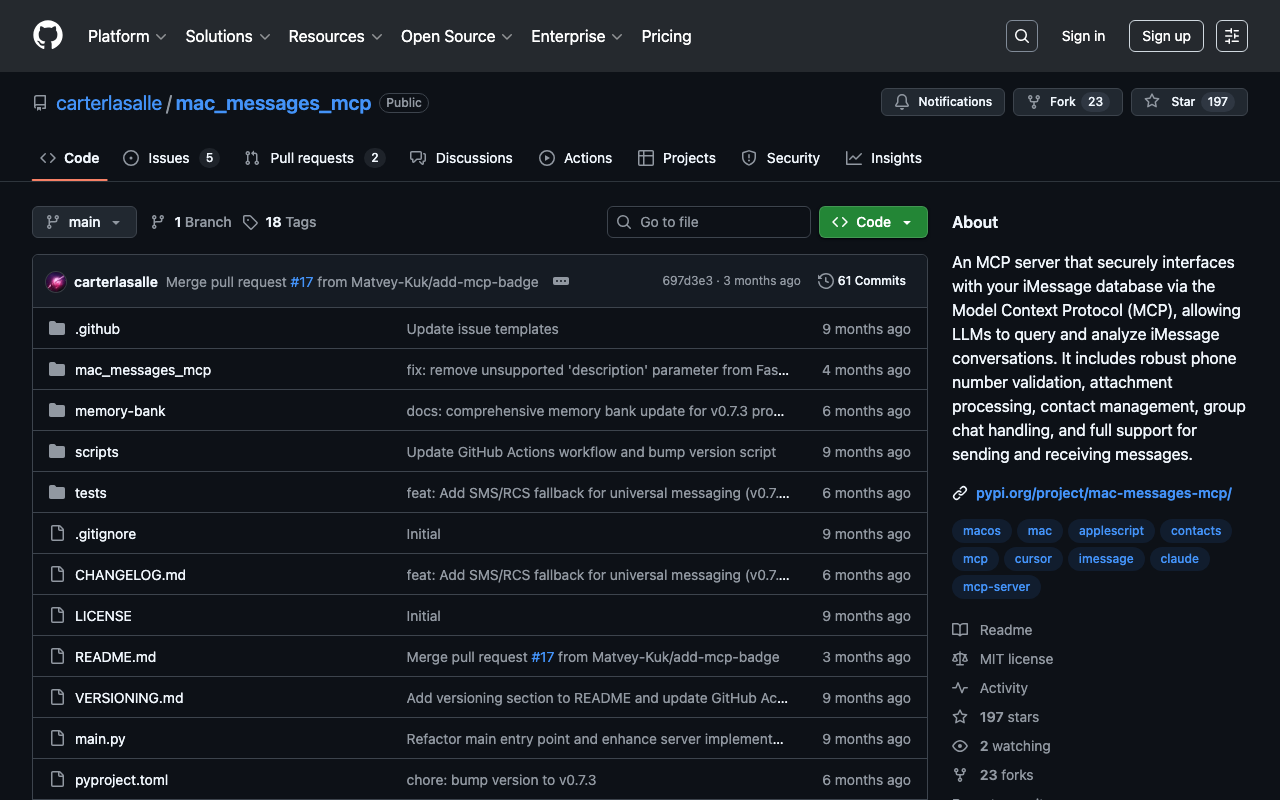An MCP server that securely interfaces with your iMessage database via the Model Context Protocol (MCP), allowing LLMs to query and analyze iMessage conversations. It includes robust phone number validation, attachment processing, contact management, group chat handling, and full support for sending and receiving messages.