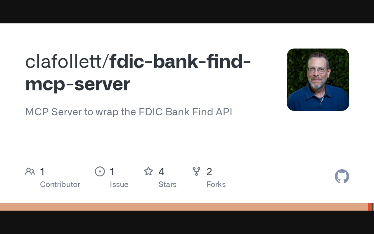The is a MCPserver that brings the power of FDIC BankFind APIs straight to your AI tools and workflows. Structured U.S. banking data, delivered with maximum vibes. 😎📊