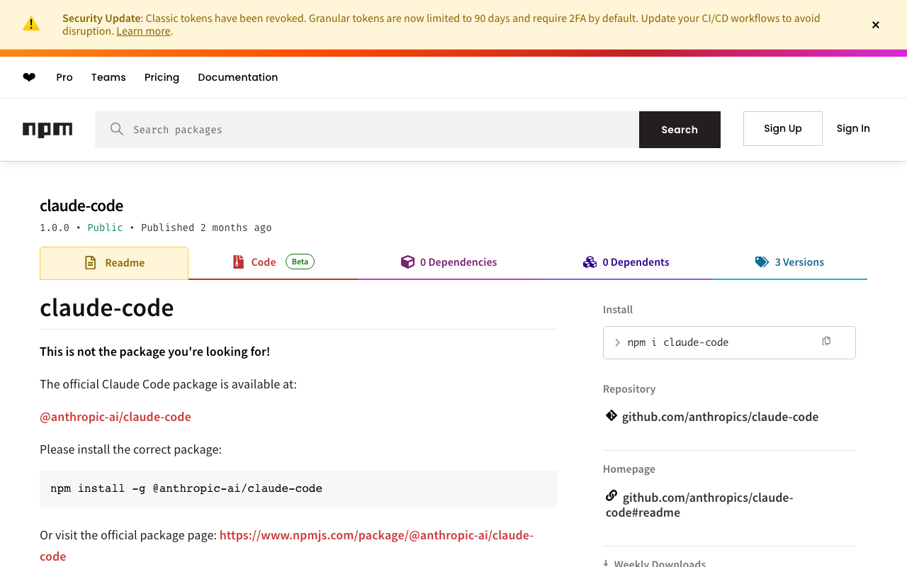 Pointer to the official Claude Code package at @anthropic-ai/claude-code