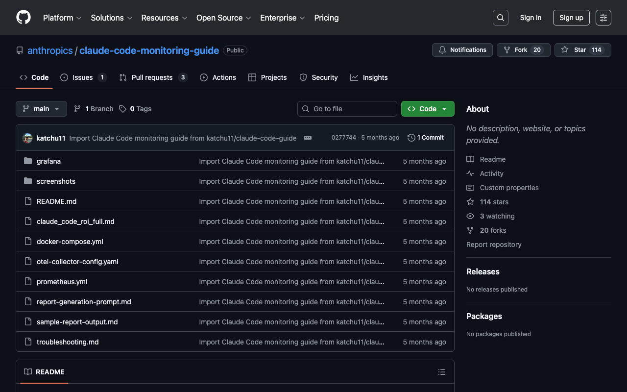Official Anthropic resource for Claude code monitoring guide. Part of the Claude ecosystem maintained by Anthropic.