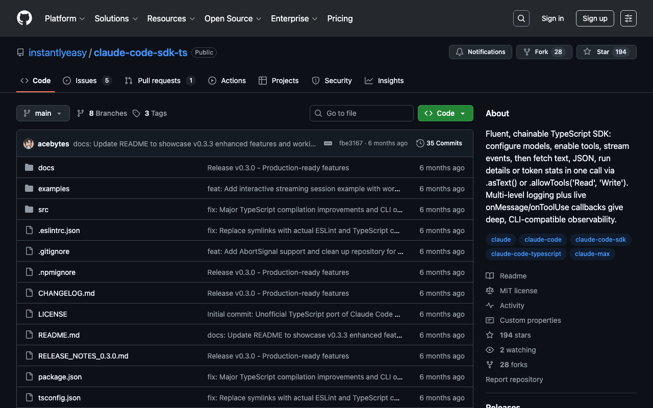 Fluent, chainable TypeScript SDK: configure models, enable tools, stream events, then fetch text, JSON, run details or token stats in one call via .asText() or .allowTools('Read', 'Write'). Multi-level logging plus live onMessage/onToolUse callbacks give deep, CLI-compatible observability.