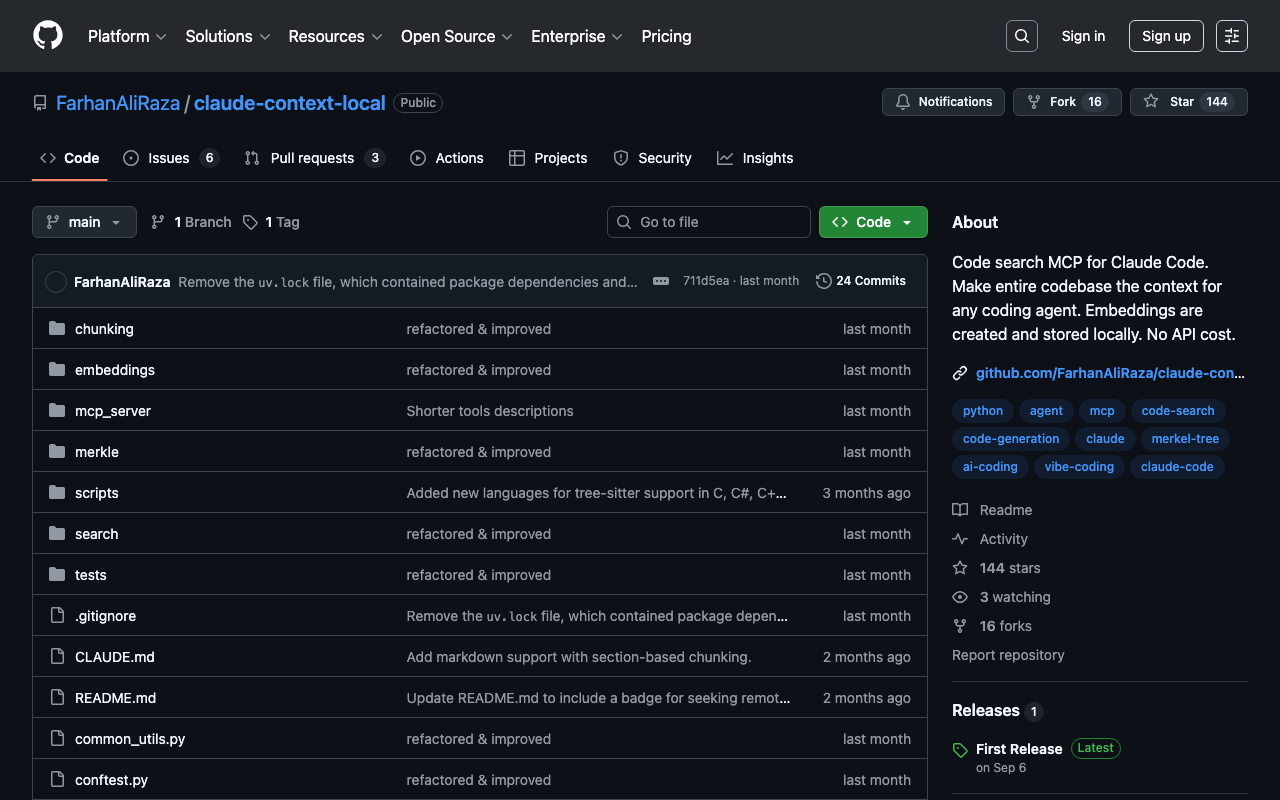 Code search MCP for Claude Code. Make entire codebase the context for any coding agent. Embeddings are created and stored locally. No API cost.