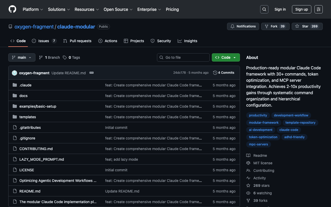 Production-ready modular Claude Code framework with 30+ commands, token optimization, and MCP server integration. Achieves 2-10x productivity gains through systematic command organization and hierarchical configuration.