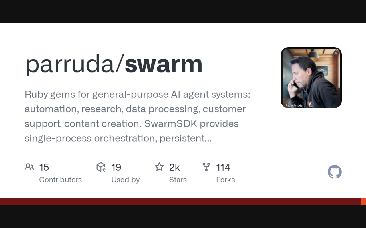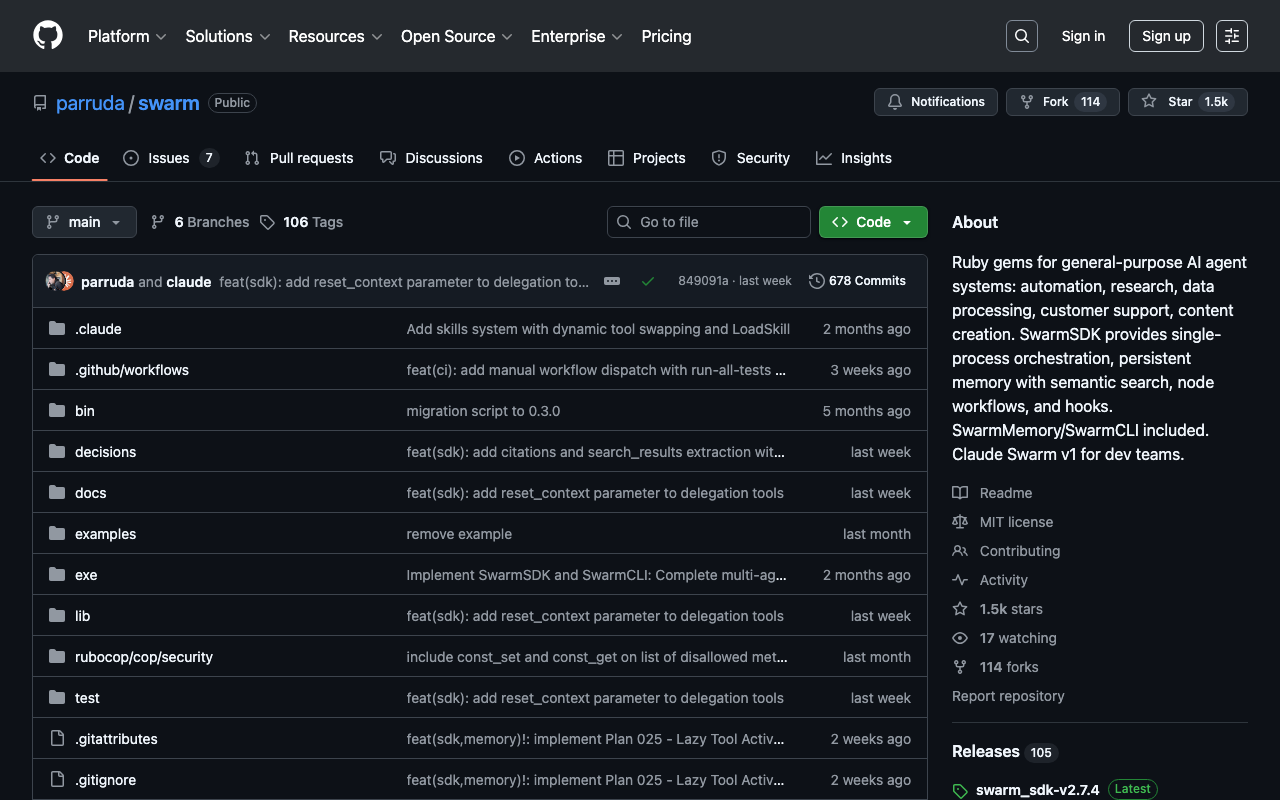 Ruby gems for general-purpose AI agent systems: automation, research, data processing, customer support, content creation. SwarmSDK provides single-process orchestration, persistent memory with semantic search, node workflows, and hooks. SwarmMemory/SwarmCLI included. Claude Swarm v1 for dev teams.