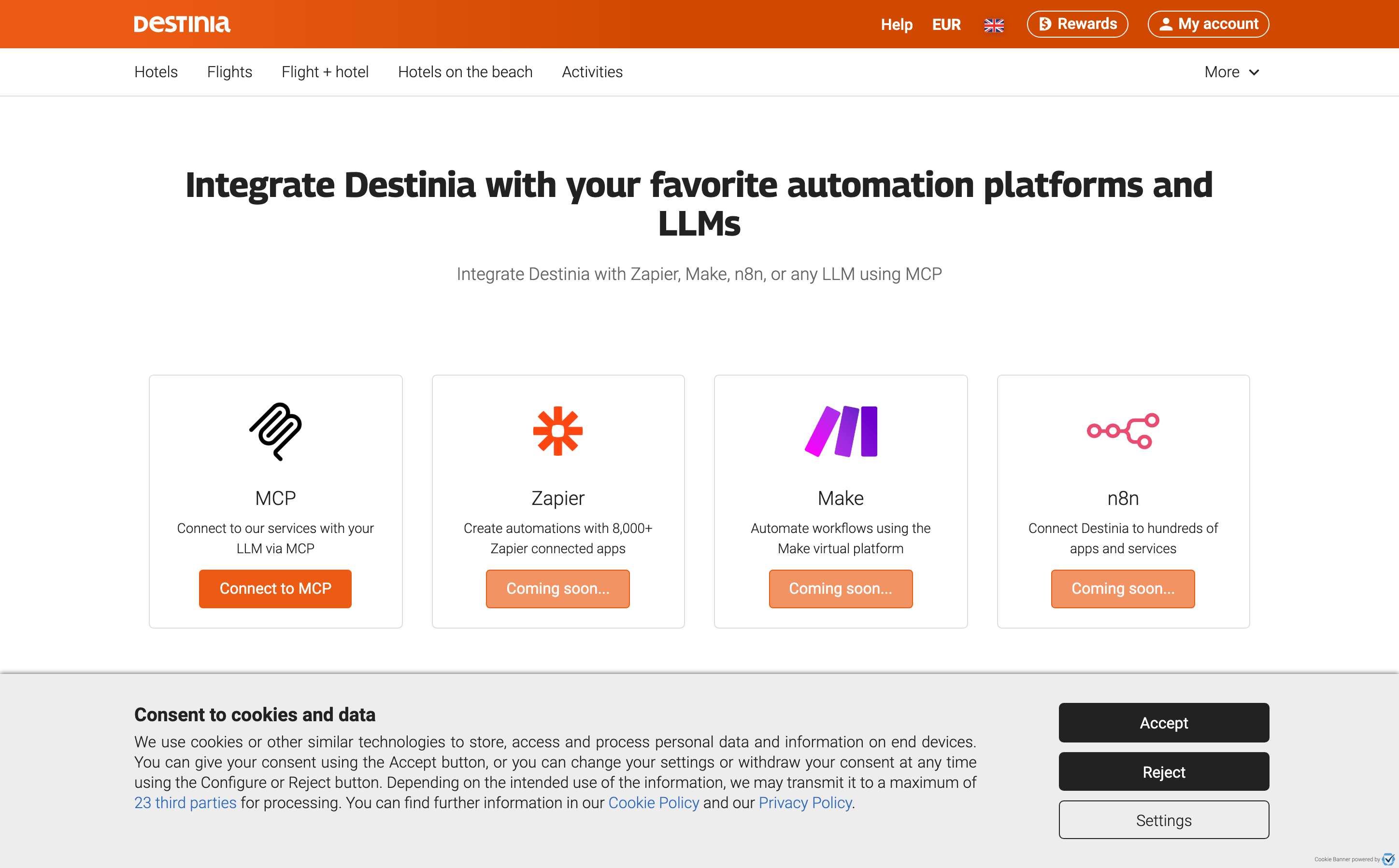 Provider tools to search for hotels in Destinia and get listing details.