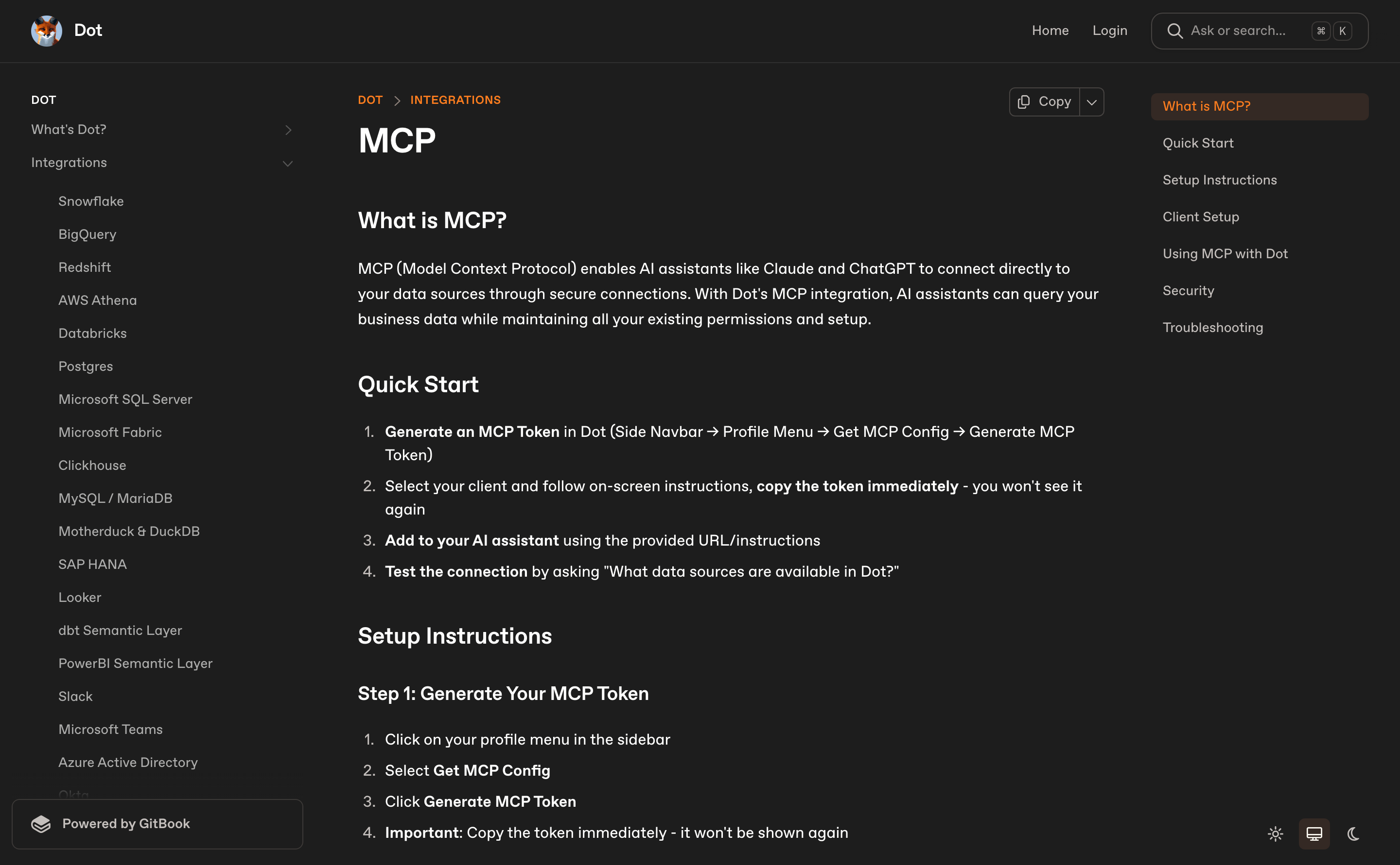 Fetch, analyze or visualize data from your favorite database or data warehouse (Snowflake, BigQuery, Redshift, Databricks, Clickhouse, ...) with [Dot](https://getdot.ai), your AI Data Analyst. This remote MCP server is a one-click integration for user that have setup Dot.