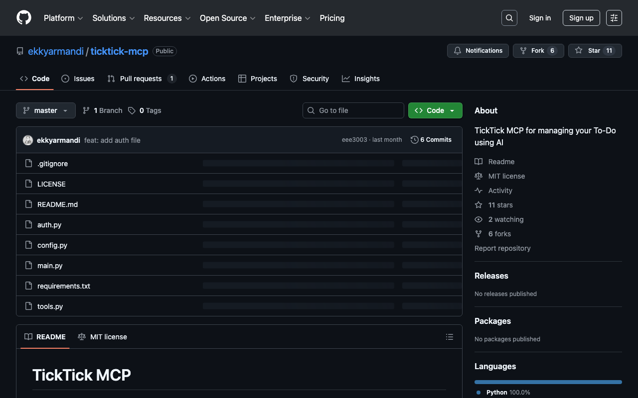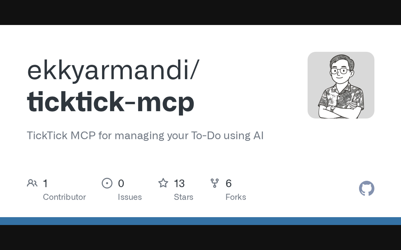 Extend Claude with ekkyarmandi ticktick mcp capabilitiesIntegrate external data into AI conversationsAutomate workflows combining Claude with specialized servicesBuild custom AI-powered development tools