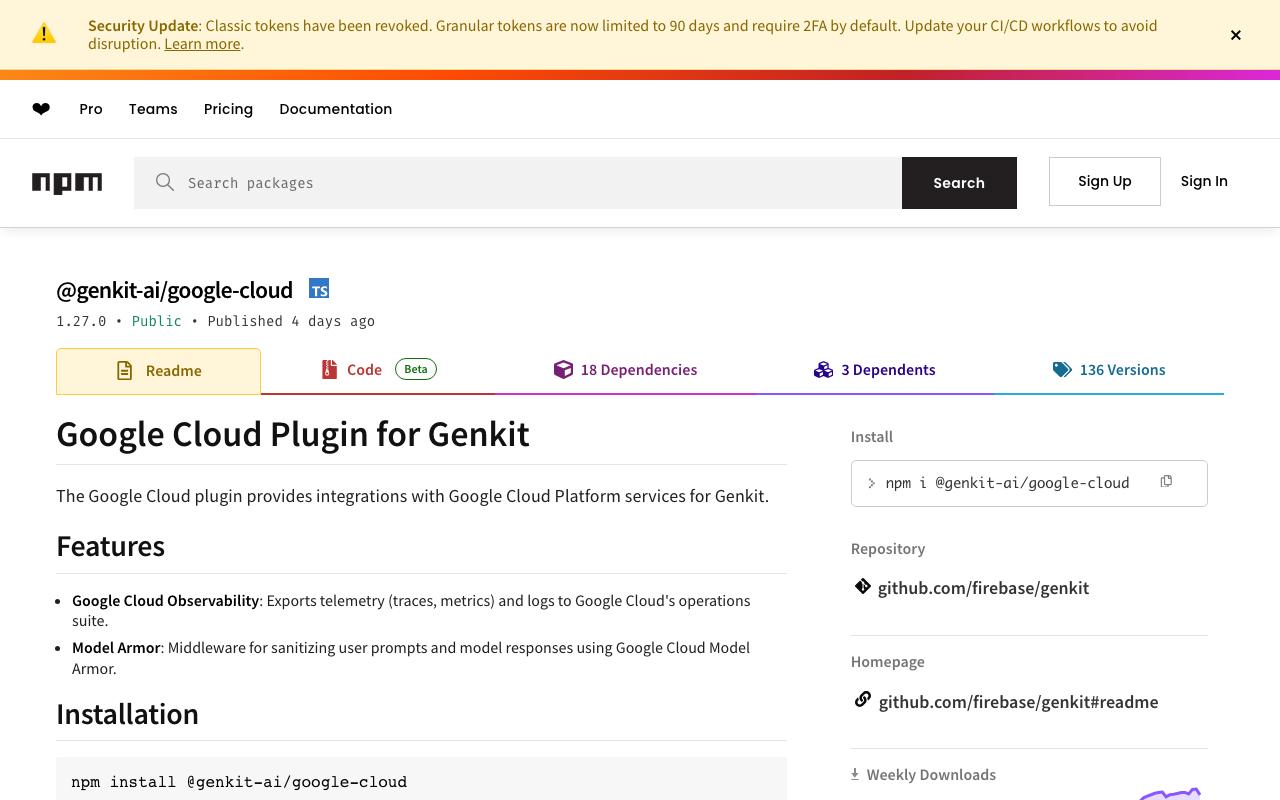 Genkit AI framework plugin for Google Cloud Platform including Firestore trace/state store and deployment helpers for Cloud Functions for Firebase.