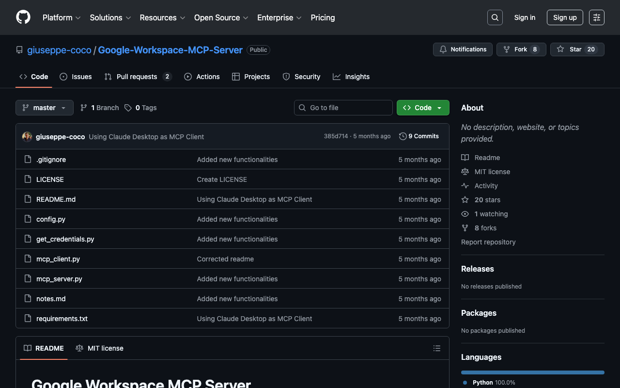 Extend Claude with giuseppe coco Google Workspace MCP Server capabilitiesIntegrate external data into AI conversationsAutomate workflows combining Claude with specialized servicesBuild custom AI-powered development tools