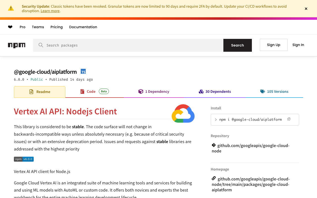 SDK library for @google cloud/aiplatform. Provides programmatic access to AI capabilities with type-safe interfaces and helper utilities.