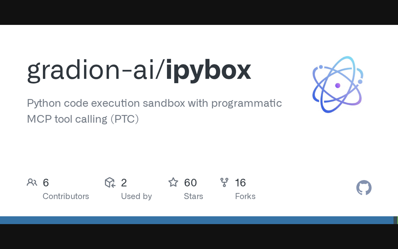 Python code execution sandbox based on IPython and Docker. Stateful code execution, file transfer between host and container, configurable network access. See [ipybox MCP server](https://gradion-ai.github.io/ipybox/mcp-server/) for details.