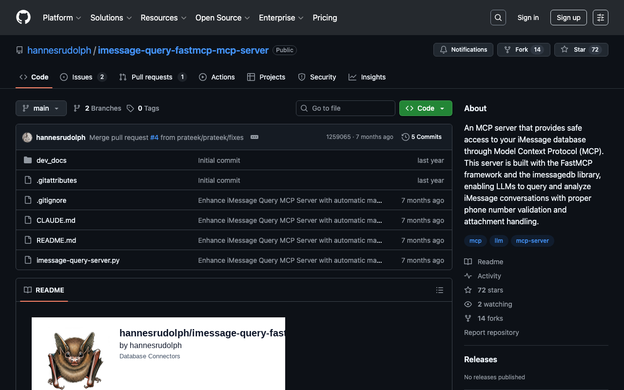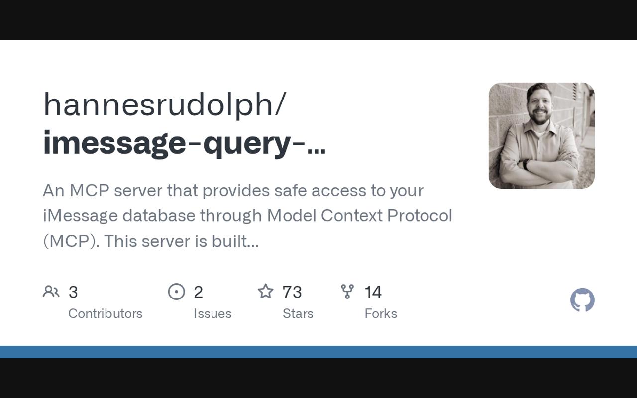 An MCP server that provides safe access to your iMessage database through Model Context Protocol (MCP). This server is built with the FastMCP framework and the imessagedb library, enabling LLMs to query and analyze iMessage conversations with proper phone number validation and attachment handling.