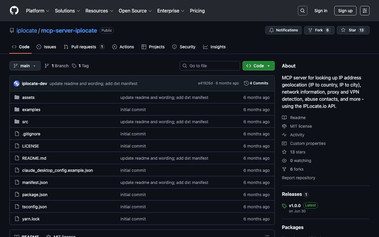 MCP server for looking up IP address geolocation (IP to country, IP to city), network information, proxy and VPN detection, abuse contacts, and more - using the IPLocate.io API.