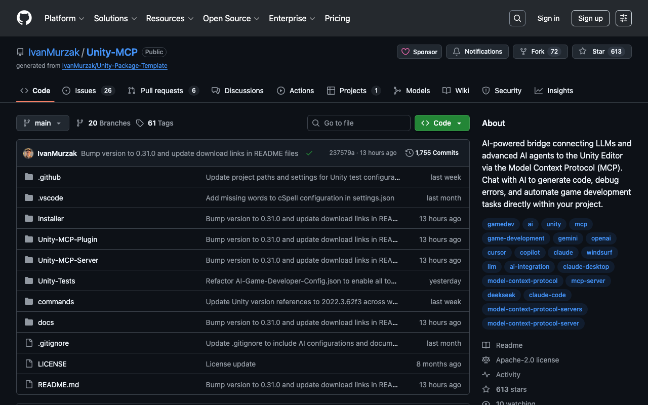AI-powered bridge connecting LLMs and advanced AI agents to the Unity Editor via the Model Context Protocol (MCP). Chat with AI to generate code, debug errors, and automate game development tasks directly within your project.