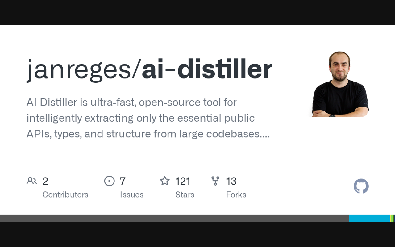 AI Distiller is ultra‑fast, open‑source tool for intelligently extracting only the essential public APIs, types, and structure from large codebases. Compresses 90–98% of code into AI‑friendly context, integrates via CLI or MCP, supports 12+ languages, and AI prompt workflows for cleaner, cost‑effective AI development.