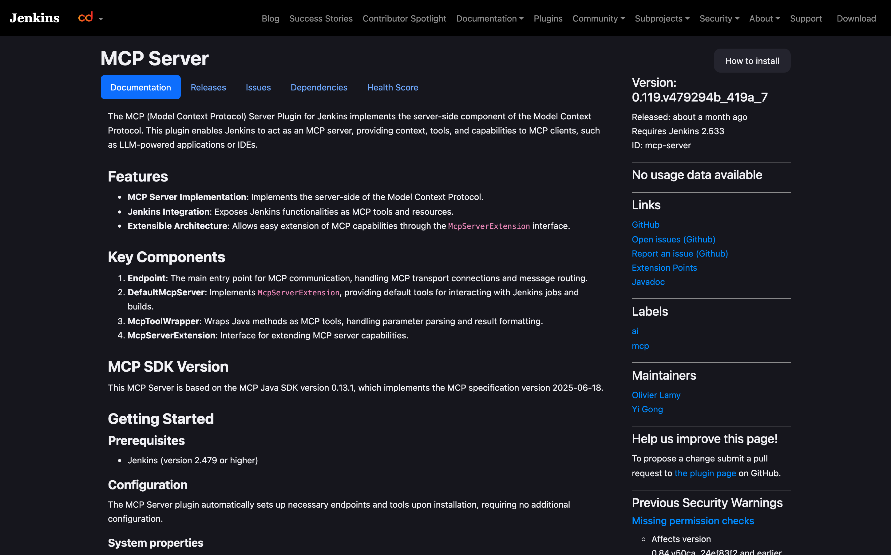 Official Jenkins MCP Server plugin enabling AI assistants to manage builds, check job statuses, retrieve logs, and integrate with CI/CD pipelines through standardized MCP interface.