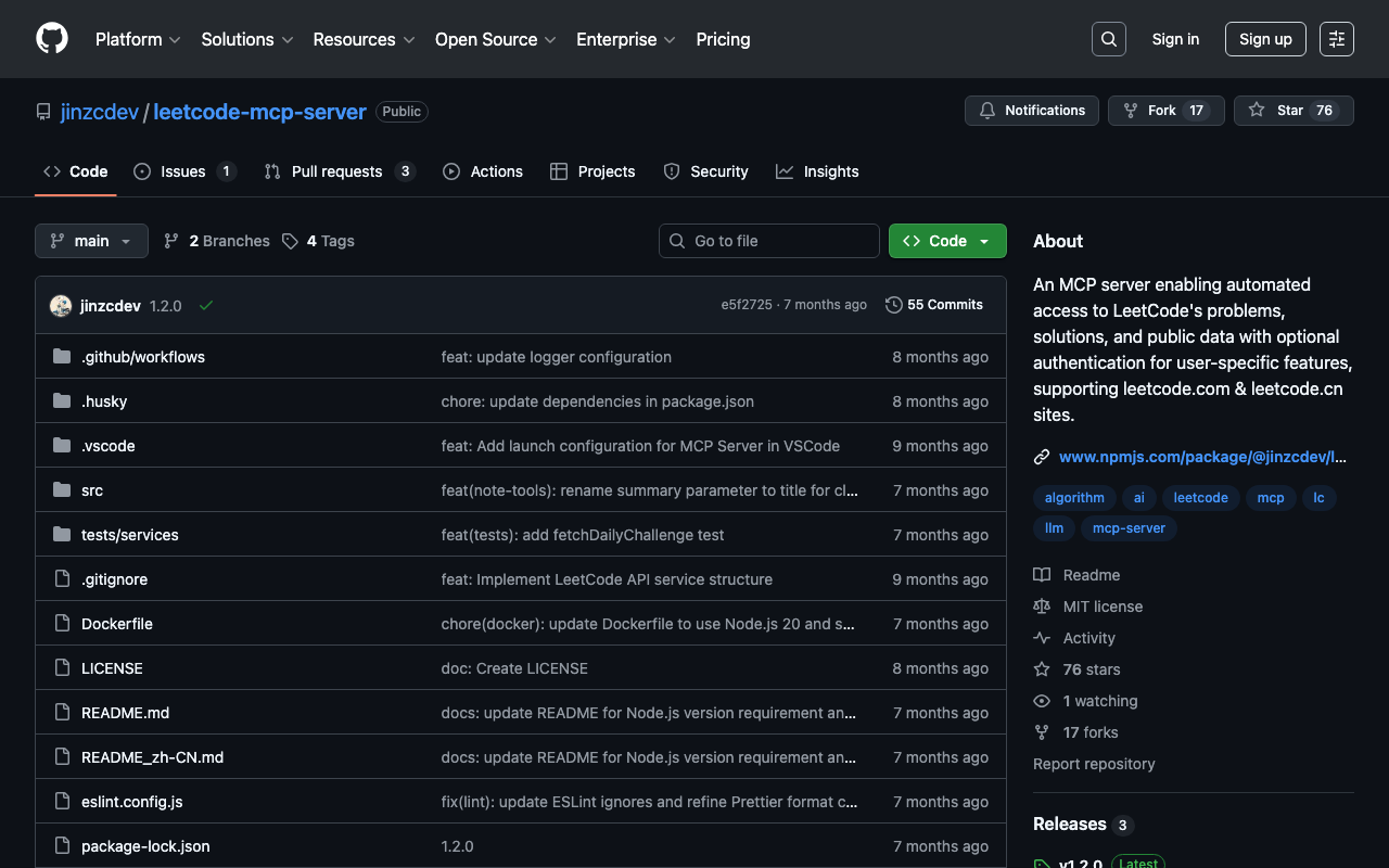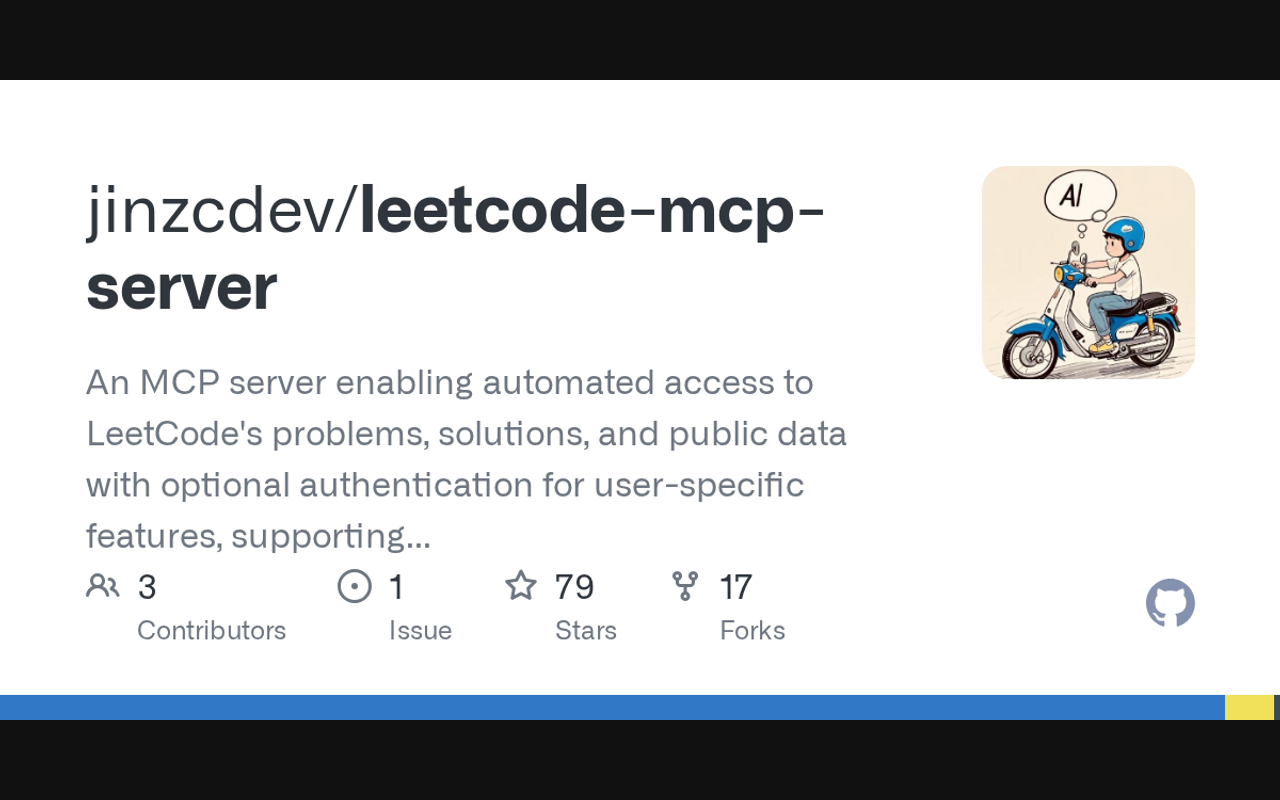 An MCP server enabling automated access to LeetCode's problems, solutions, and public data with optional authentication for user-specific features, supporting leetcode.com & leetcode.cn sites.
