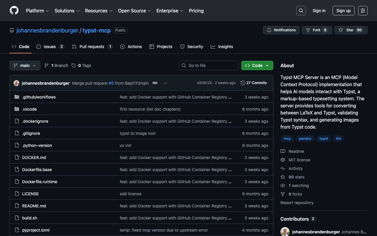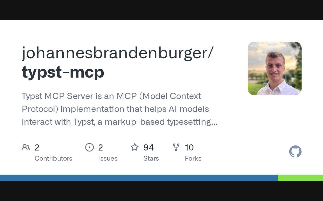 Typst MCP Server is an MCP (Model Context Protocol) implementation that helps AI models interact with Typst, a markup-based typesetting system. The server provides tools for converting between LaTeX and Typst, validating Typst syntax, and generating images from Typst code.