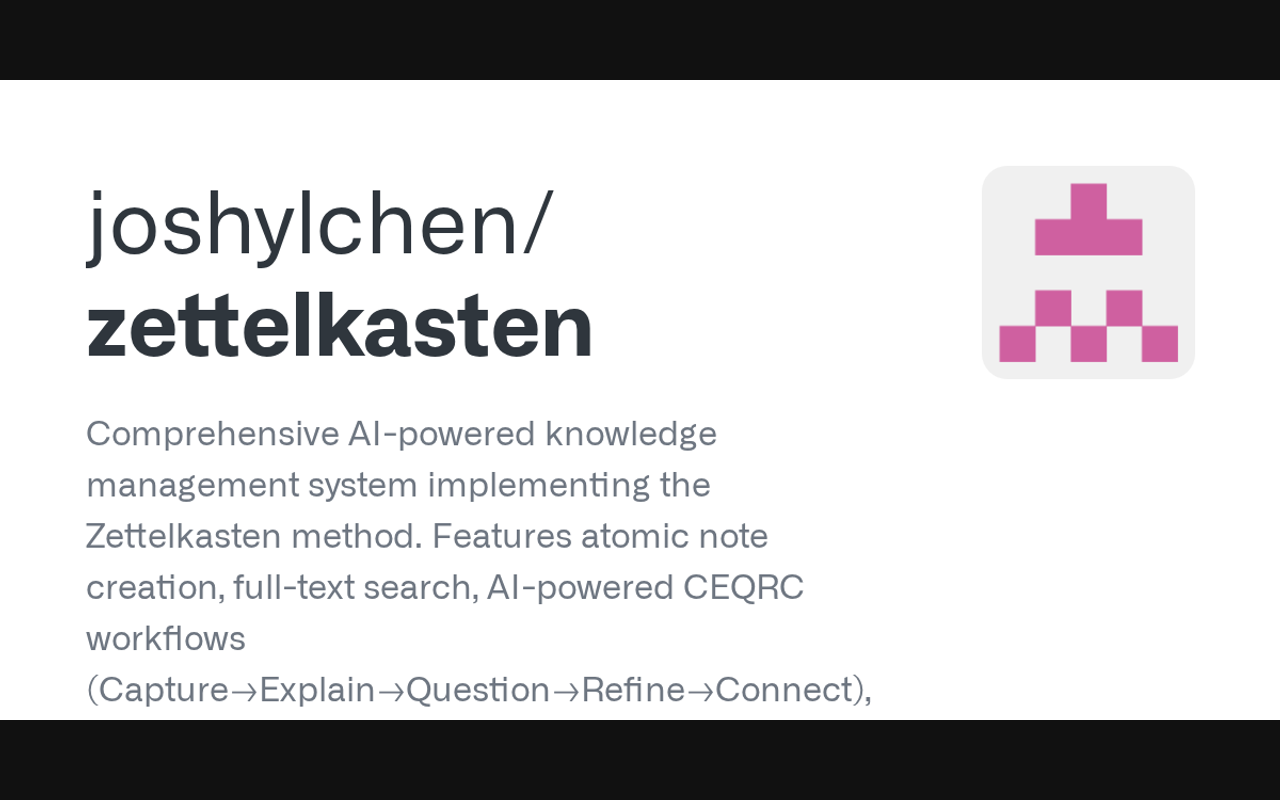 Comprehensive AI-powered knowledge management system implementing the Zettelkasten method. Features atomic note creation, full-text search, AI-powered CEQRC workflows (Capture→Explain→Question→Refine→Connect), intelligent link discovery, and multi-interface access (CLI, API, Web UI, MCP). Perfect for researchers, students, and knowledge workers.