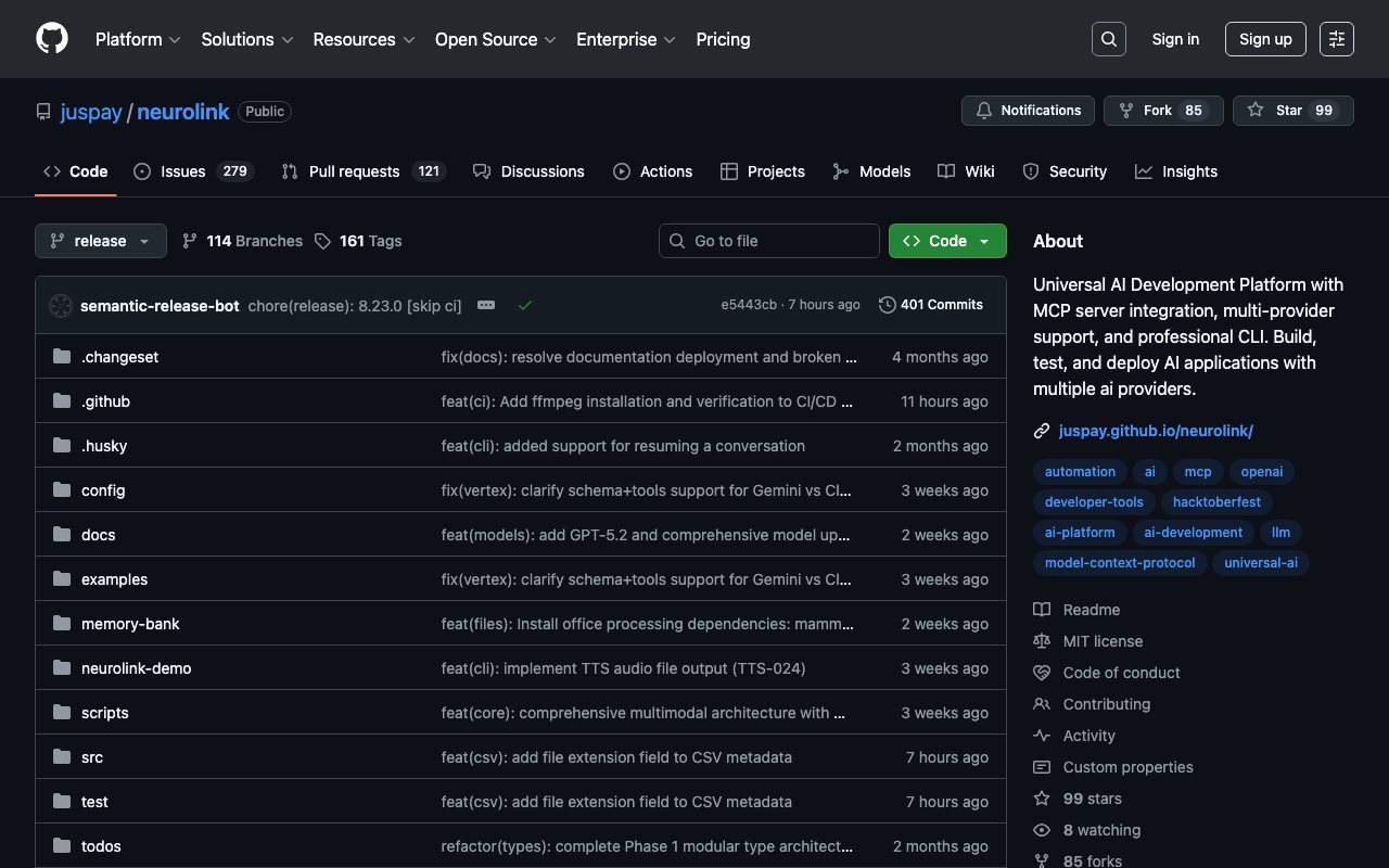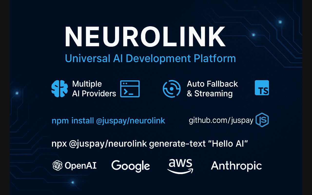Extend Claude with juspay neurolink capabilitiesIntegrate external data into AI conversationsAutomate workflows combining Claude with specialized servicesBuild custom AI-powered development tools