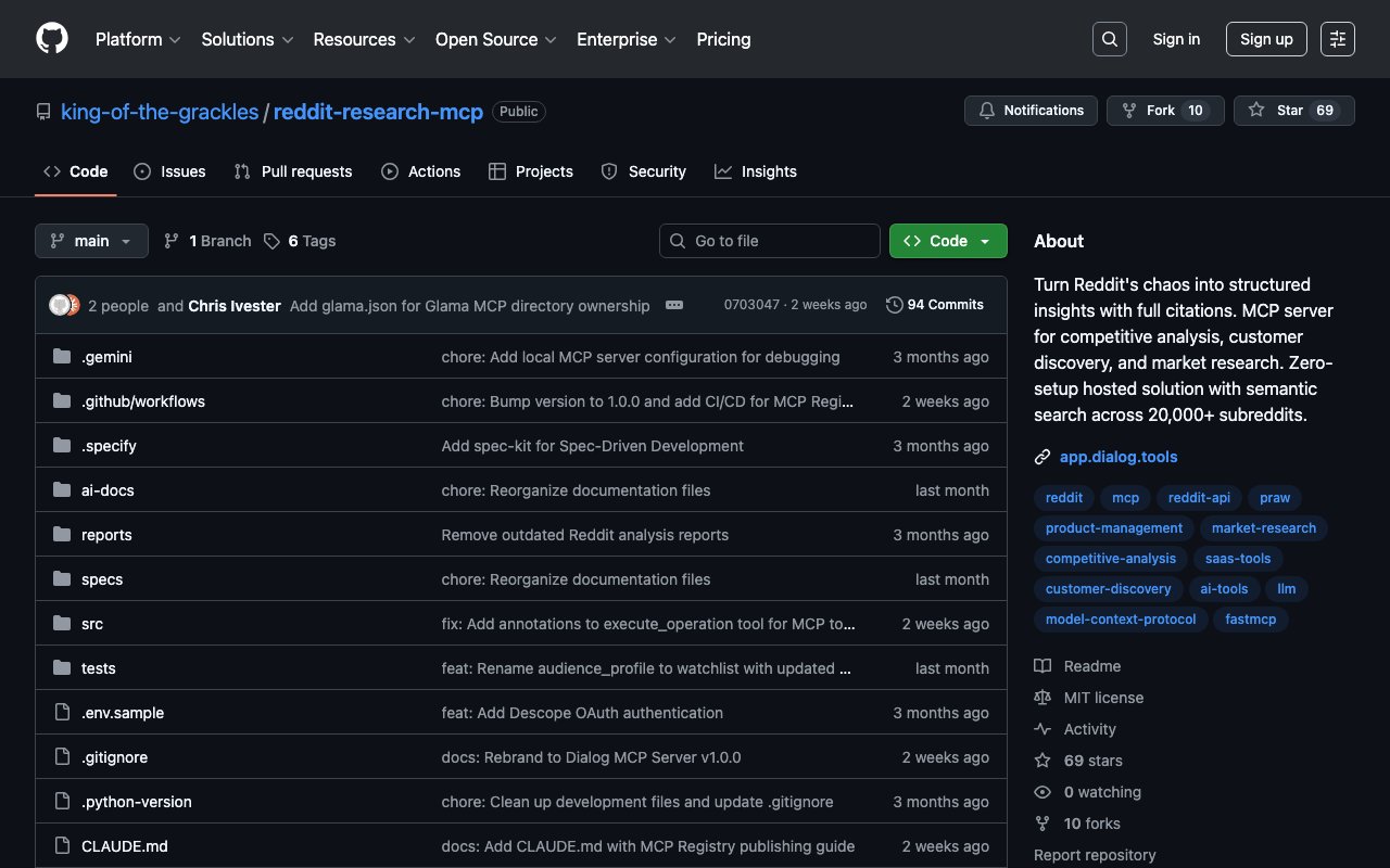 Turn Reddit's chaos into structured insights with full citations. MCP server for competitive analysis, customer discovery, and market research. Zero-setup hosted solution with semantic search across 20,000+ subreddits.