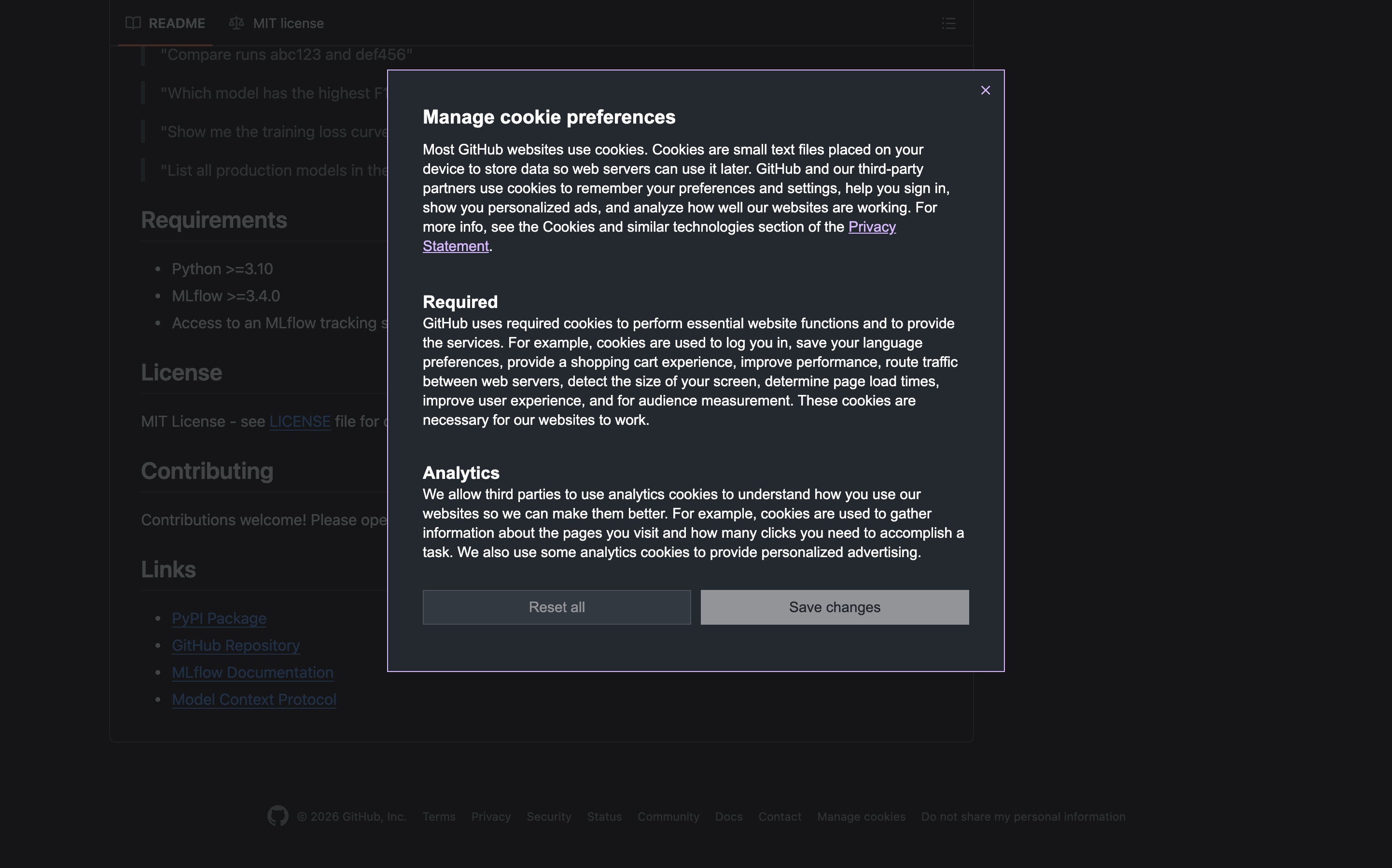MLflow MCP server for ML experiment tracking with advanced querying, run comparison, artifact access, and model registry.