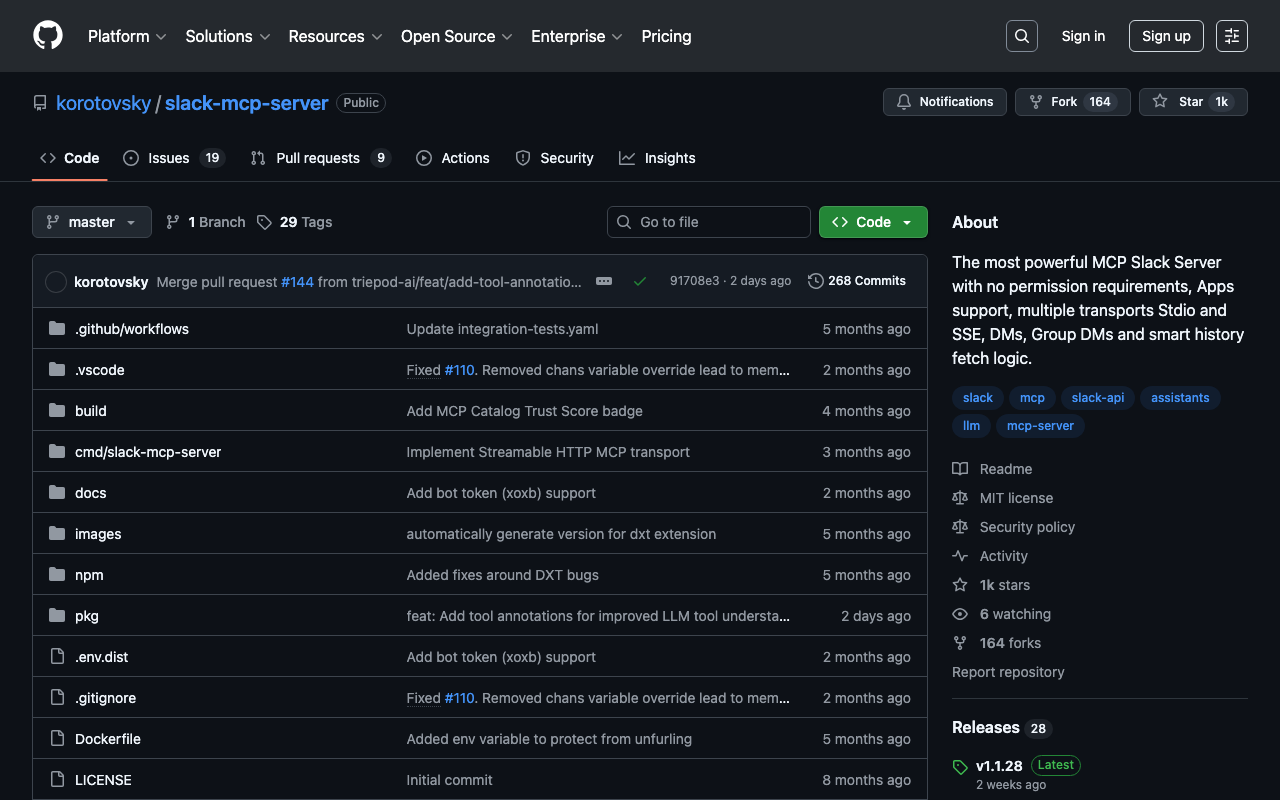 The most powerful MCP Slack Server with no permission requirements, Apps support, multiple transports Stdio and SSE, DMs, Group DMs and smart history fetch logic.
