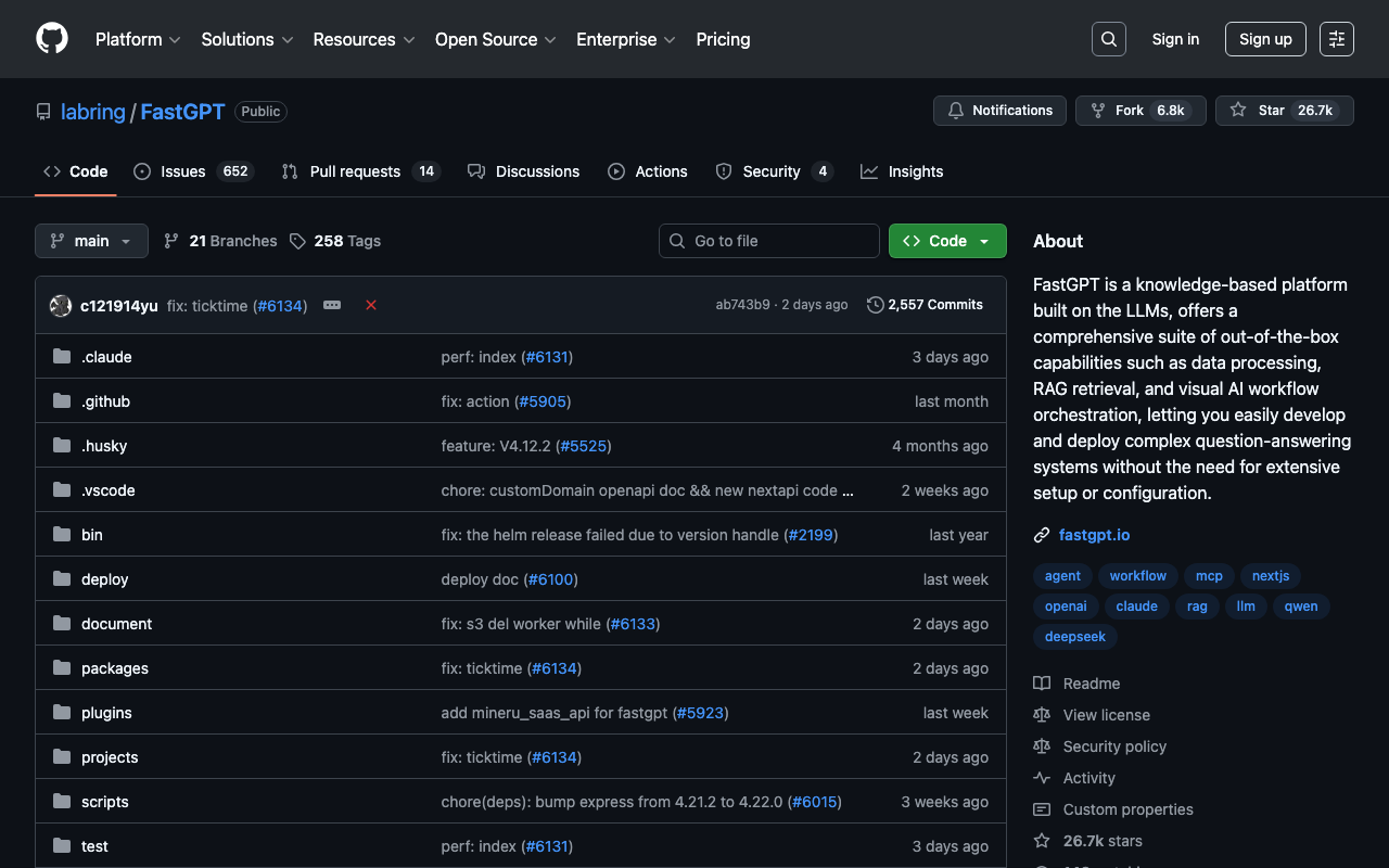 FastGPT is a knowledge-based platform built on the LLMs, offers a comprehensive suite of out-of-the-box capabilities such as data processing, RAG retrieval, and visual AI workflow orchestration, letting you easily develop and deploy complex question-answering systems without the need for extensive setup or configuration.
