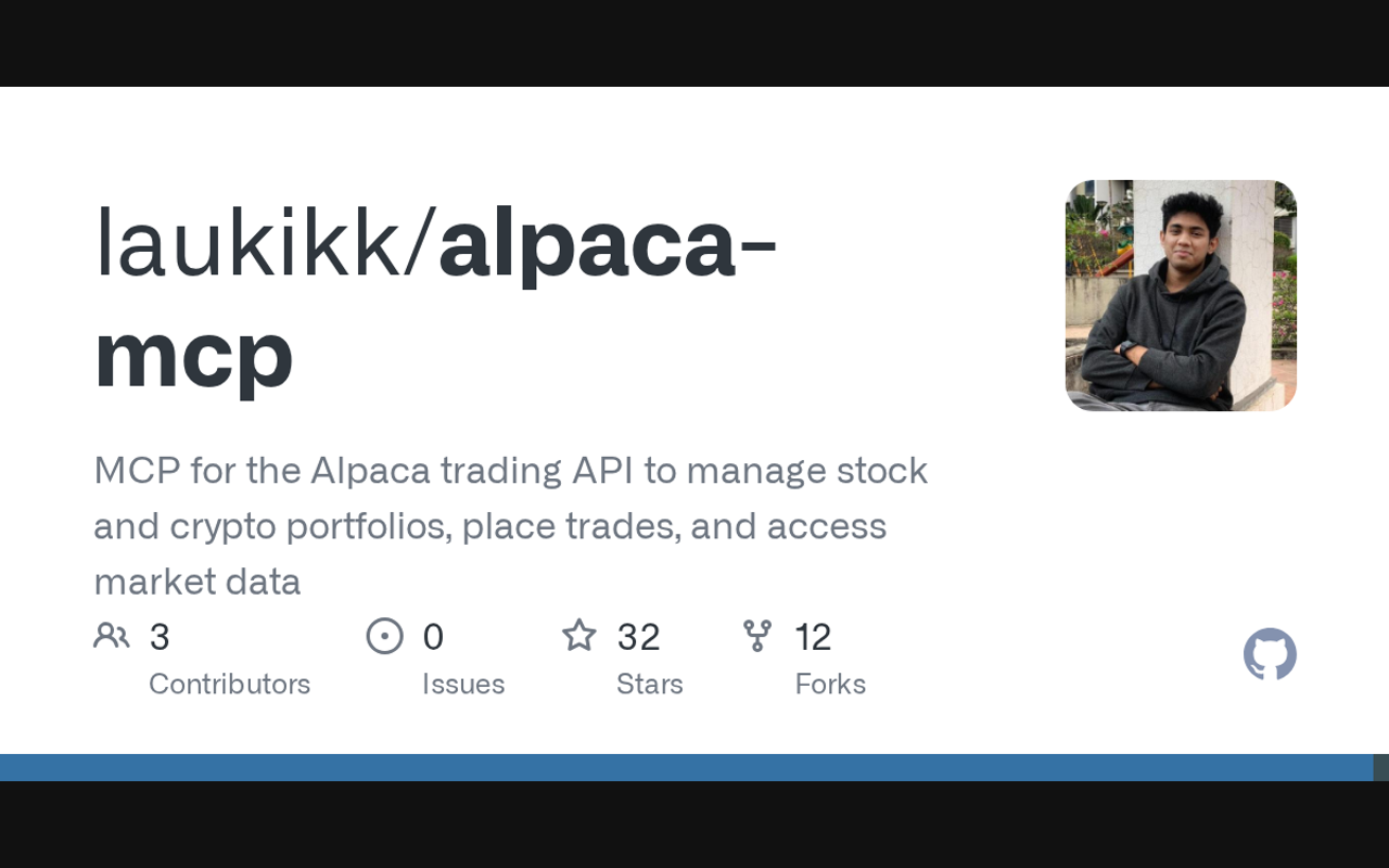 Extend Claude with laukikk alpaca mcp capabilitiesIntegrate external data into AI conversationsAutomate workflows combining Claude with specialized servicesBuild custom AI-powered development tools