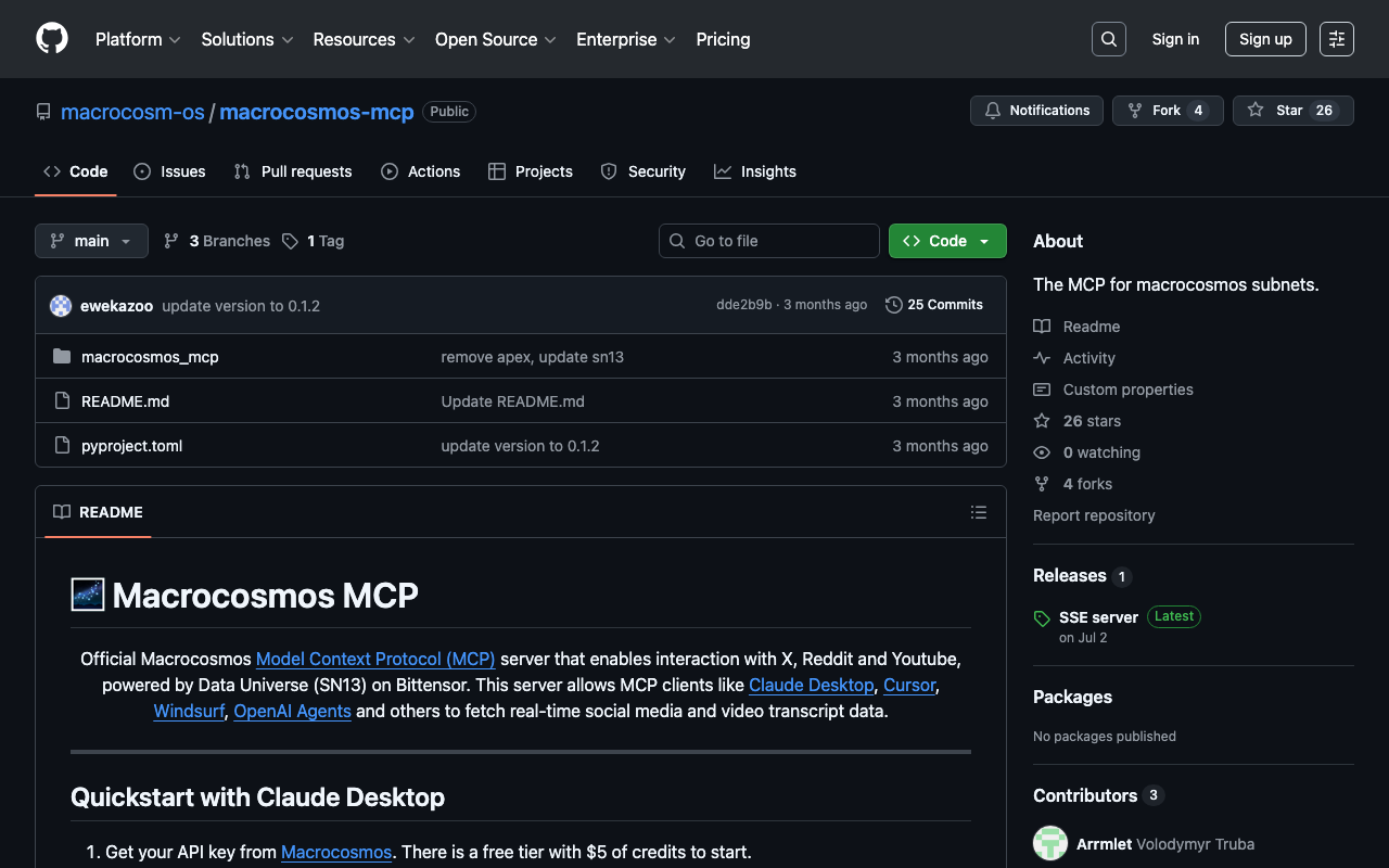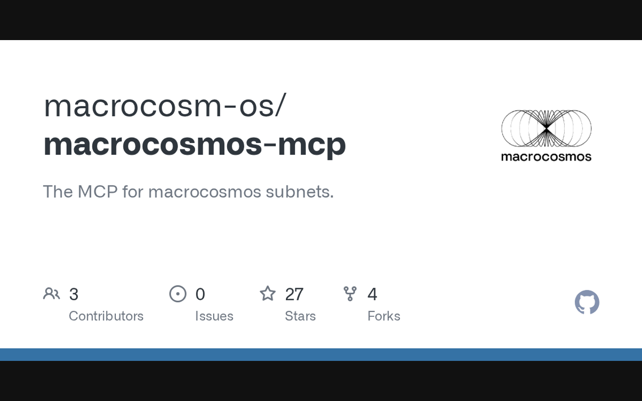 Extend Claude with macrocosm os macrocosmos mcp capabilitiesIntegrate external data into AI conversationsAutomate workflows combining Claude with specialized servicesBuild custom AI-powered development tools