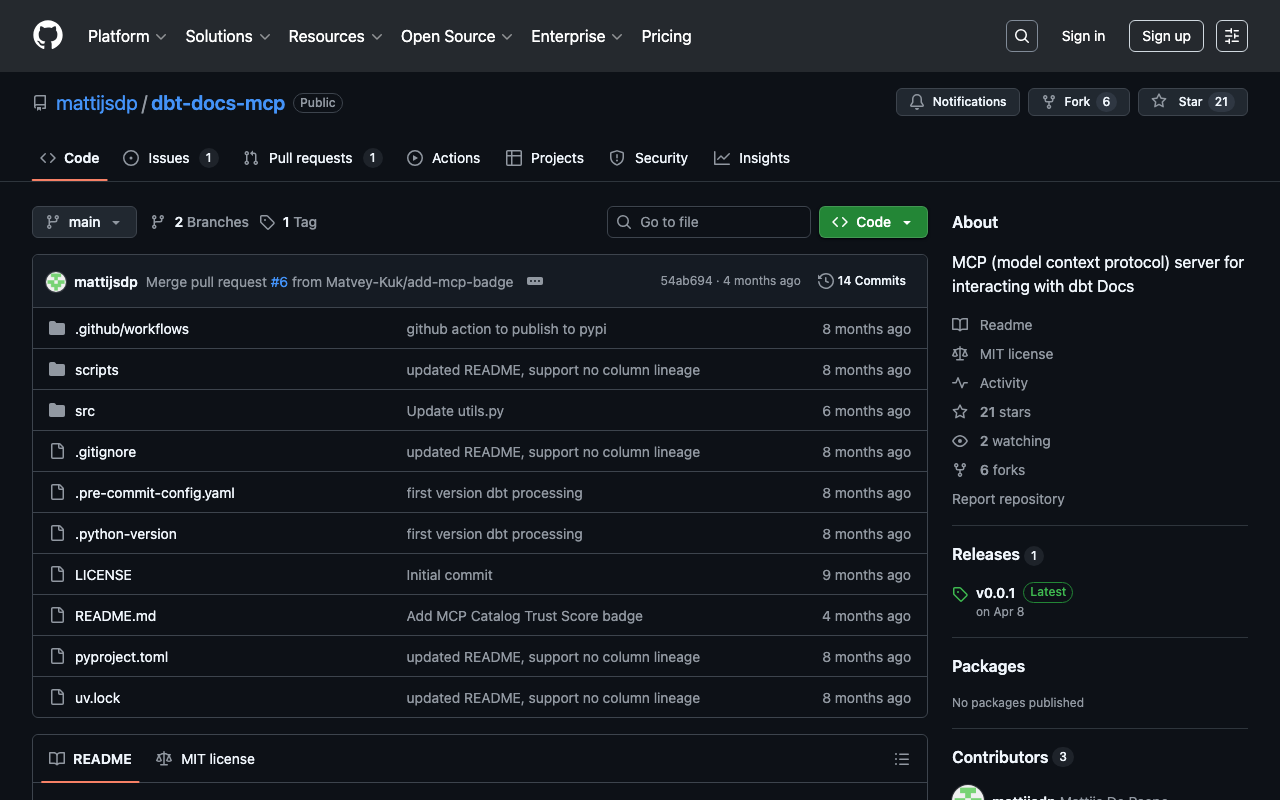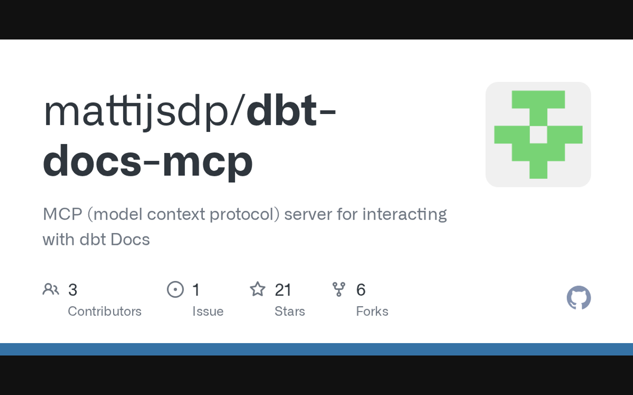 Extend Claude with mattijsdp dbt docs mcp capabilitiesIntegrate external data into AI conversationsAutomate workflows combining Claude with specialized servicesBuild custom AI-powered development tools