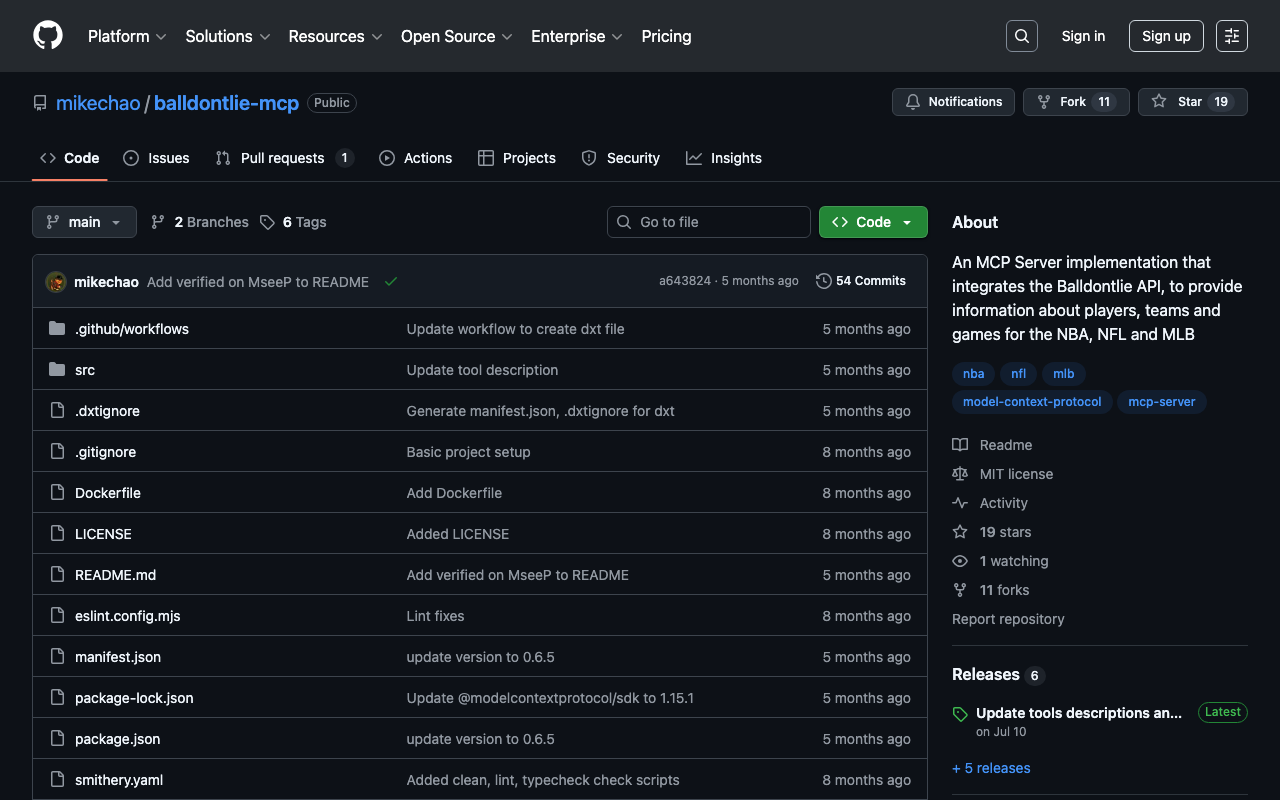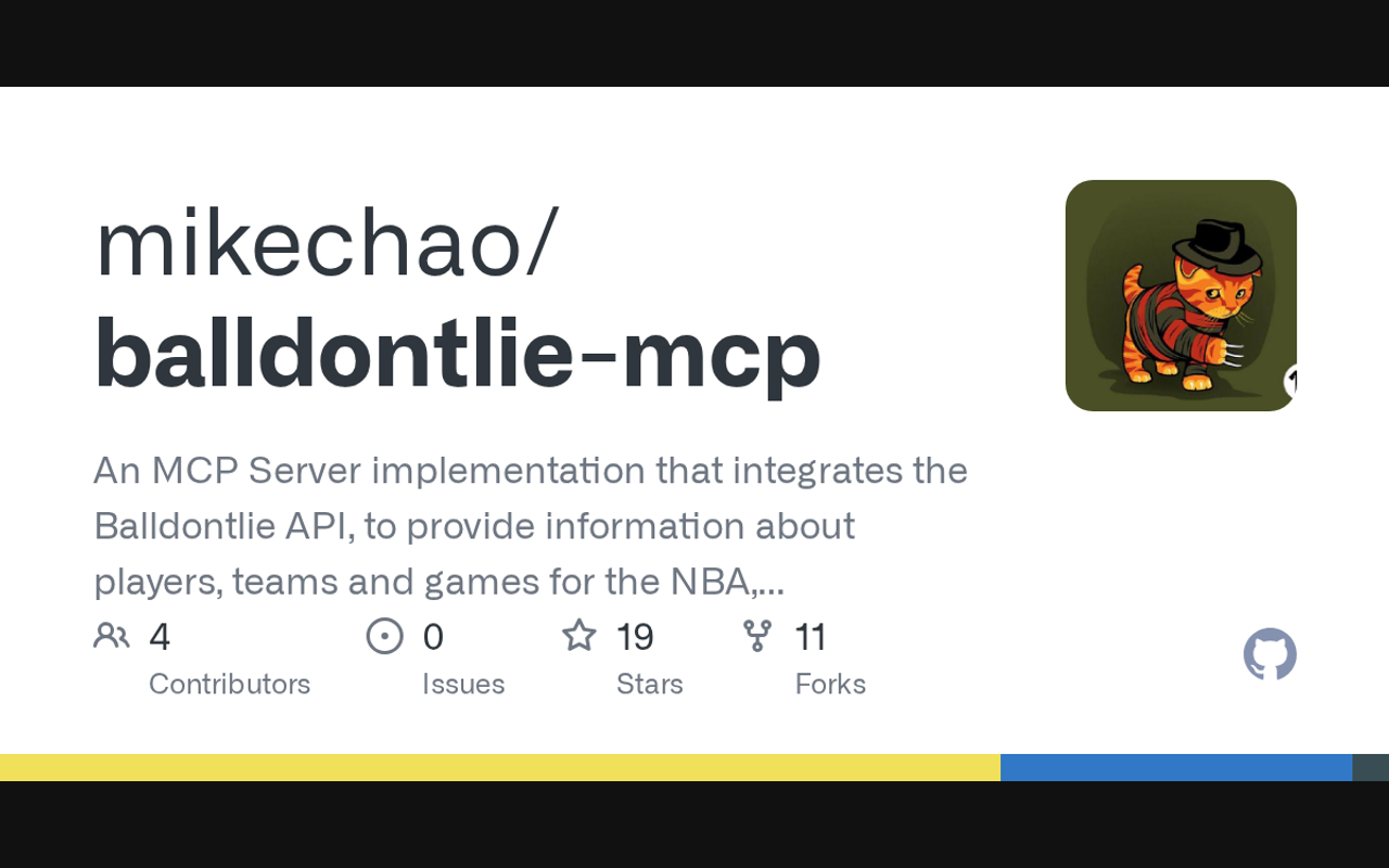 Extend Claude with mikechao balldontlie mcp capabilitiesIntegrate external data into AI conversationsAutomate workflows combining Claude with specialized servicesBuild custom AI-powered development tools