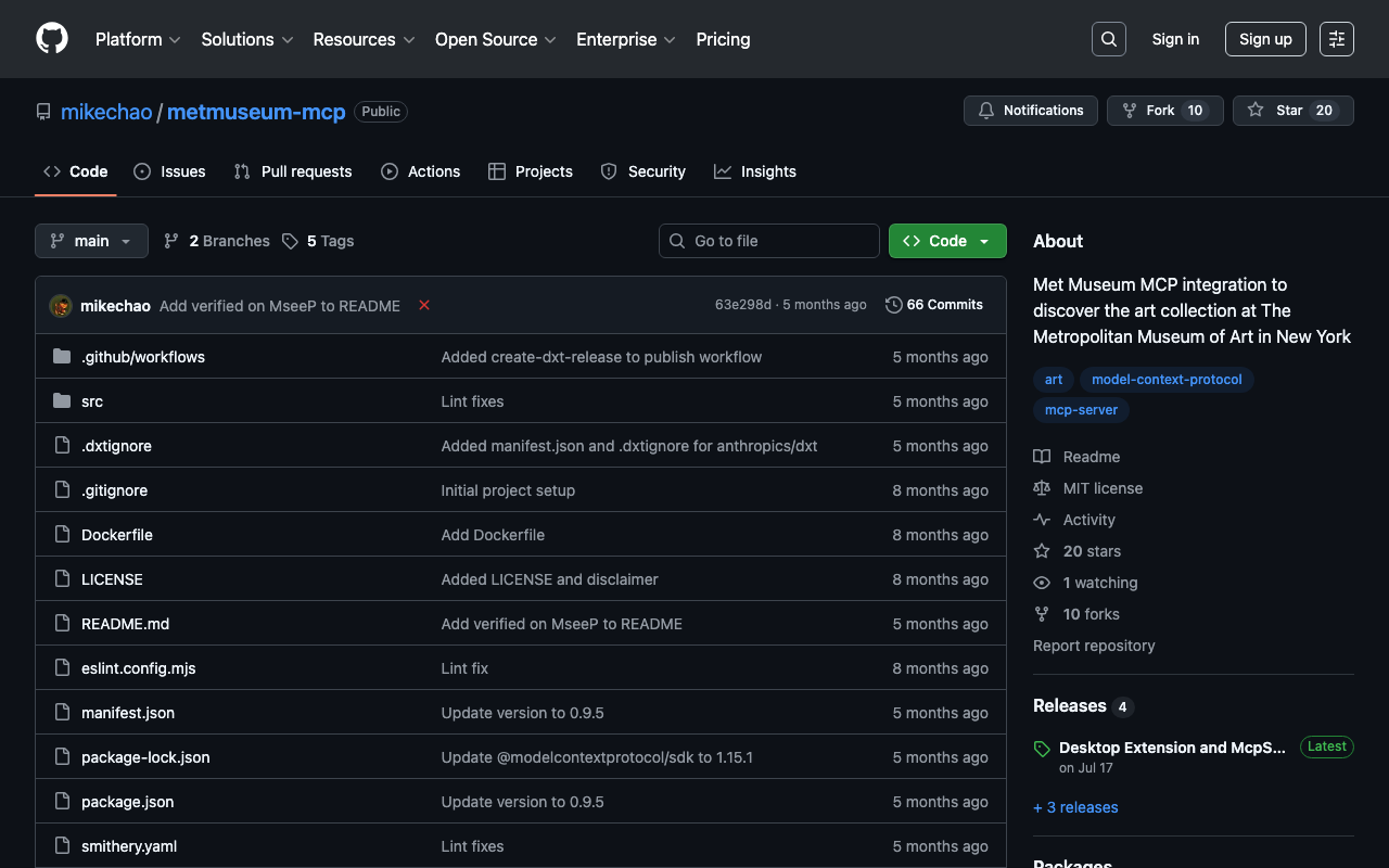 Extend Claude with mikechao metmuseum mcp capabilitiesIntegrate external data into AI conversationsAutomate workflows combining Claude with specialized servicesBuild custom AI-powered development tools