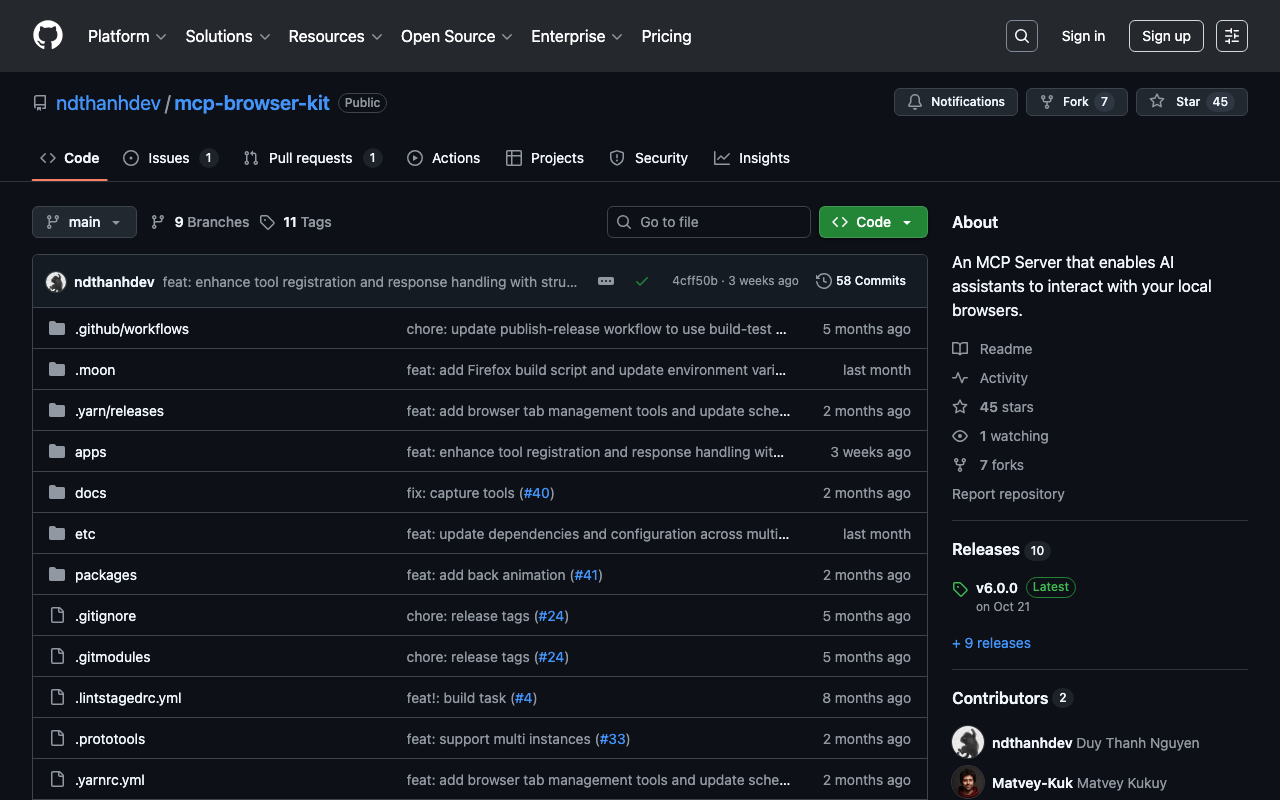 Extend Claude with ndthanhdev mcp browser kit capabilitiesIntegrate external data into AI conversationsAutomate workflows combining Claude with specialized servicesBuild custom AI-powered development tools