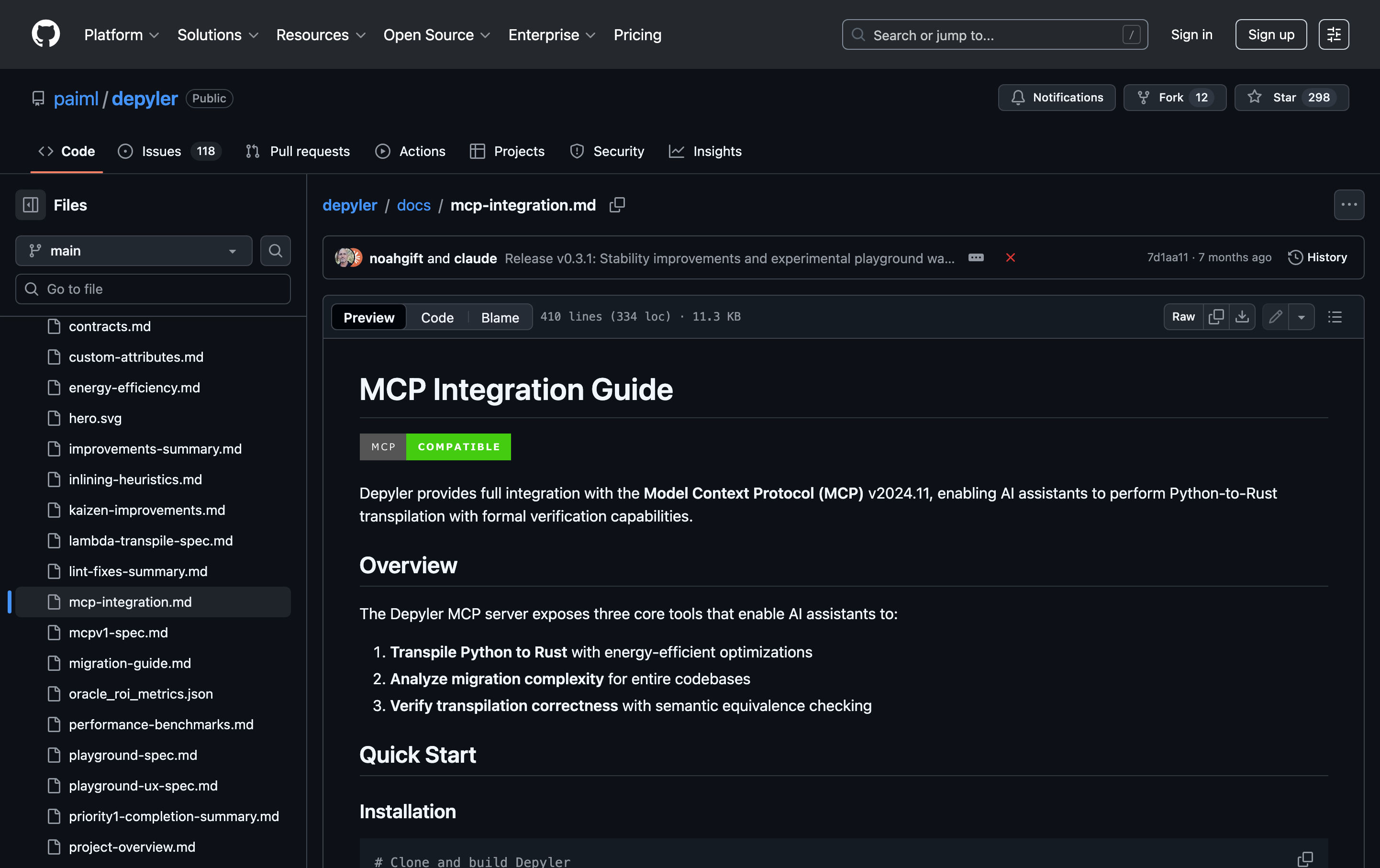 Energy-efficient Python-to-Rust transpiler with progressive verification, enabling AI assistants to convert Python code to safe, performant Rust while reducing energy consumption by 75-85%.