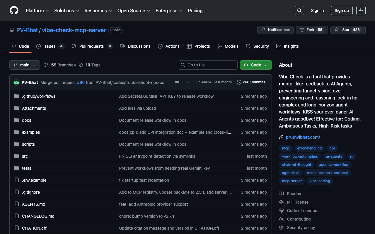 Vibe Check is a tool that provides mentor-like feedback to AI Agents, preventing tunnel-vision, over-engineering and reasoning lock-in for complex and long-horizon agent workflows. KISS your over-eager AI Agents goodbye! Effective for: Coding, Ambiguous Tasks, High-Risk tasks