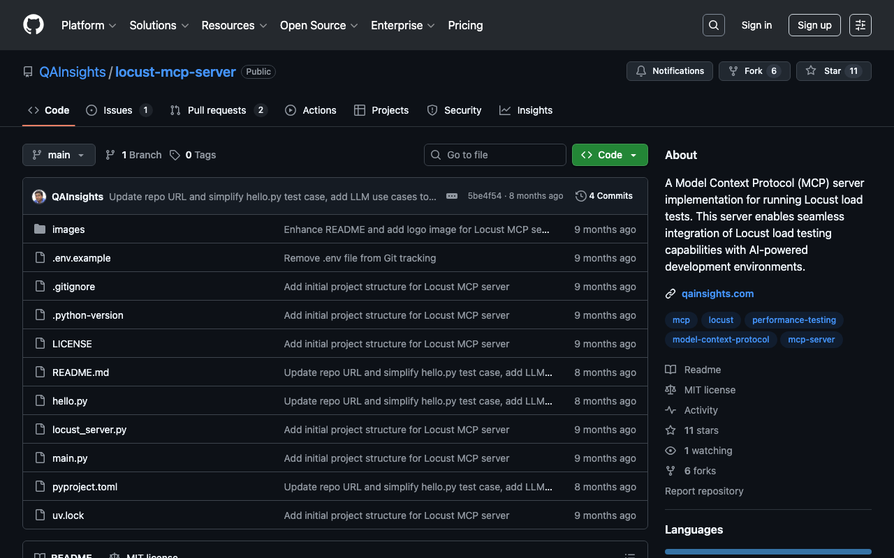 A Model Context Protocol (MCP) server implementation for running Locust load tests. This server enables seamless integration of Locust load testing capabilities with AI-powered development environments.