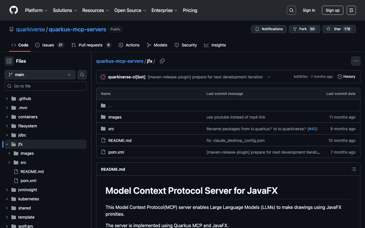 Extend Claude with quarkiverse mcp server jfx capabilitiesIntegrate external data into AI conversationsAutomate workflows combining Claude with specialized servicesBuild custom AI-powered development tools